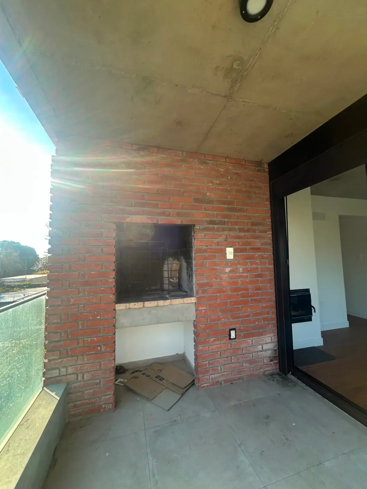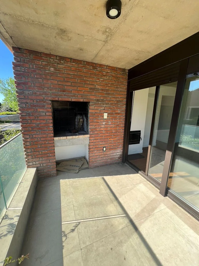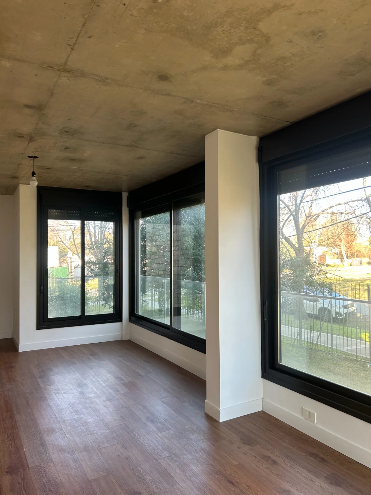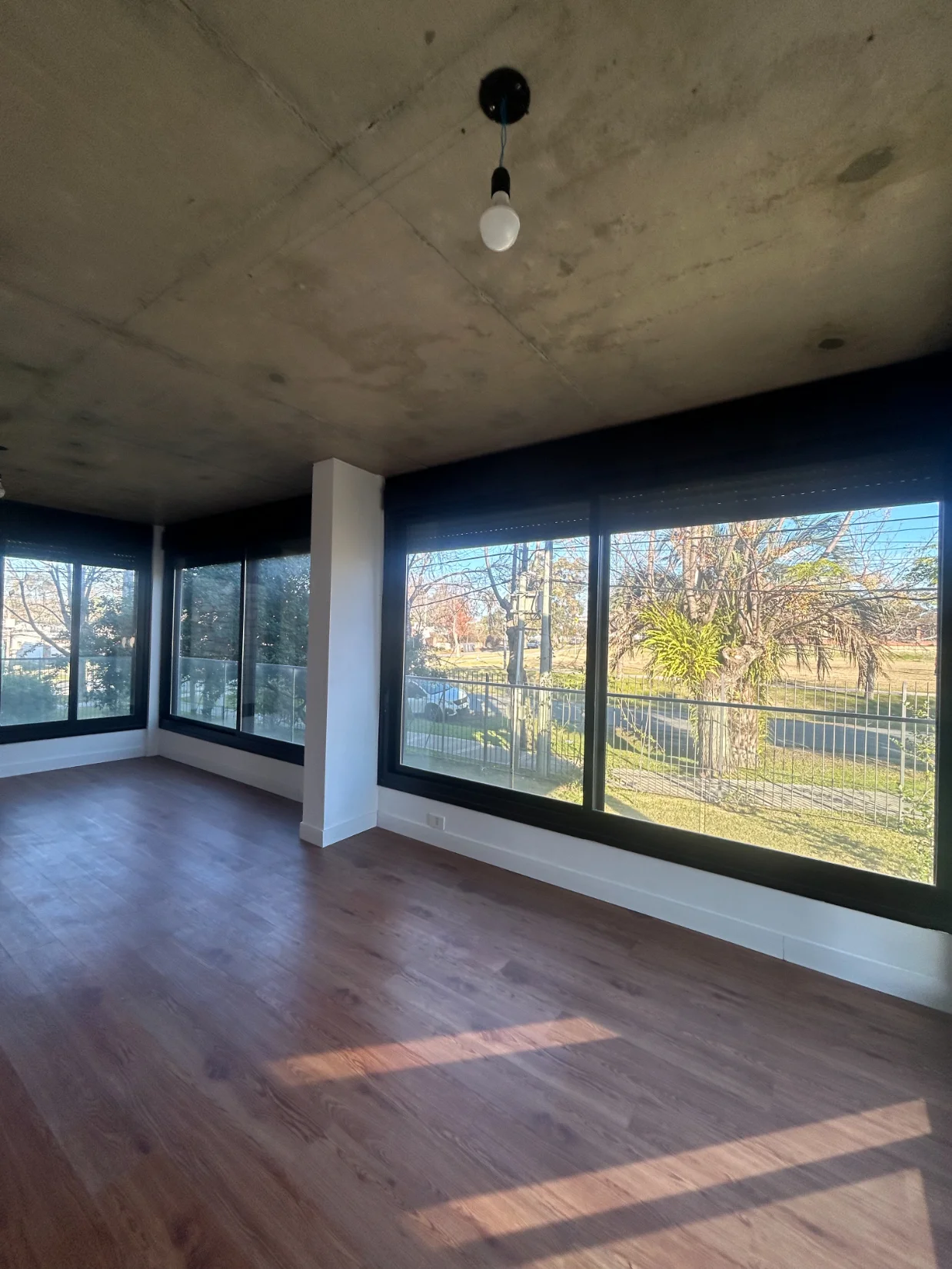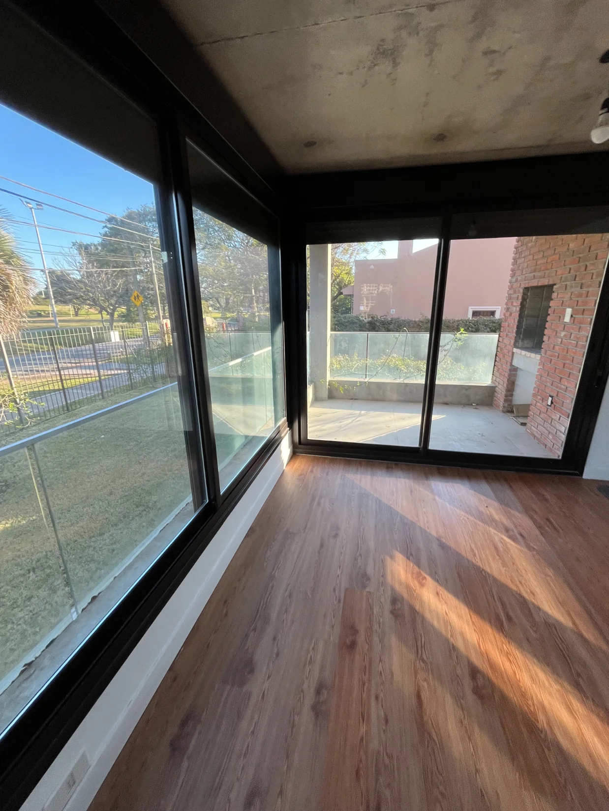 Living comedor amplio con grandes ventanales y estufa de alto rendimiento con salida a terraza con parrillero.