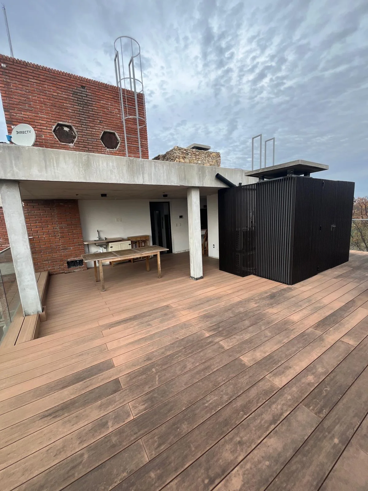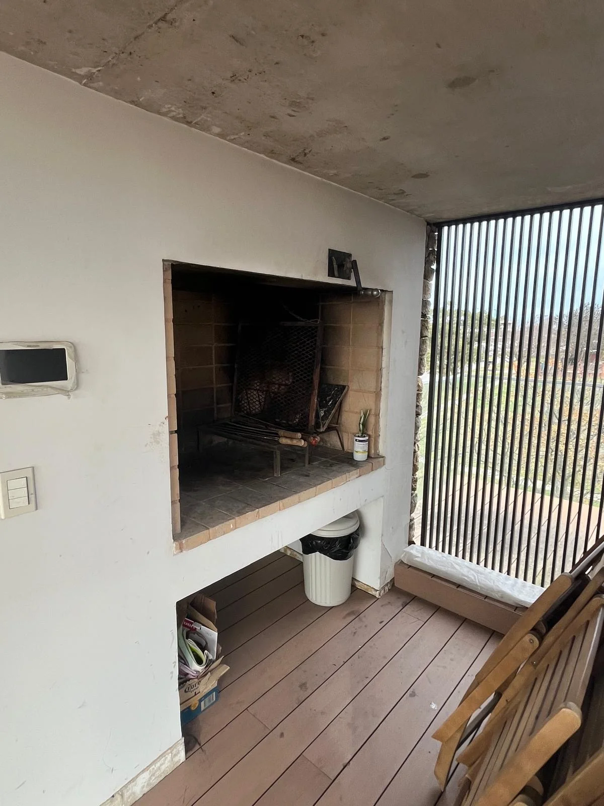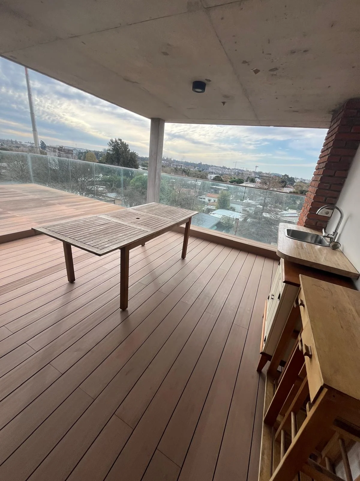 Barbacoa del edificio techada con parrillero, vajilla y gran deck.