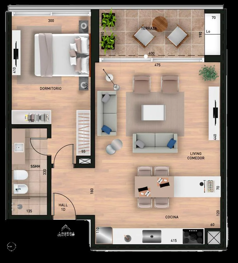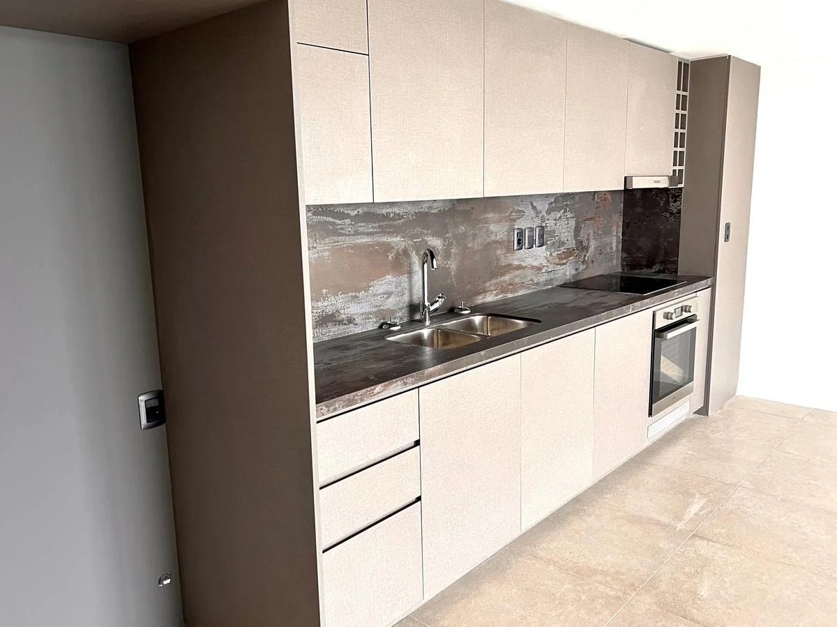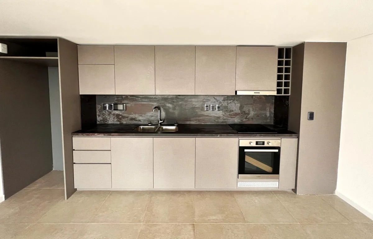 Entrada a living comedor muy amplio y luminoso con salida a terraza orientada al oeste, con vista panorámica al lago. Cocina integrada con armarios de muy buena calidad.