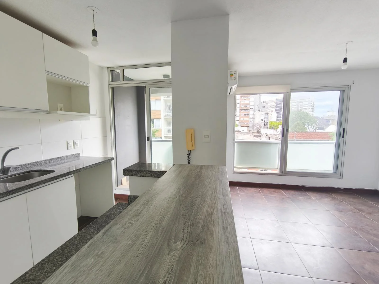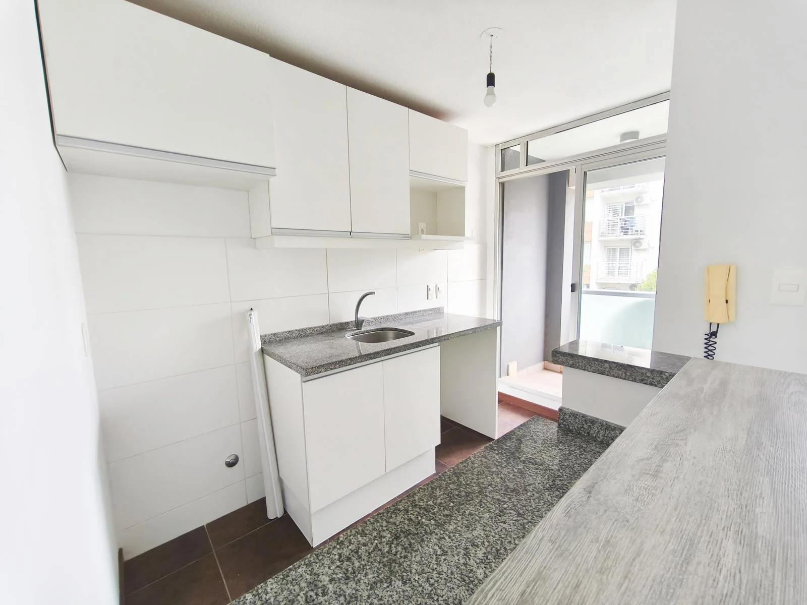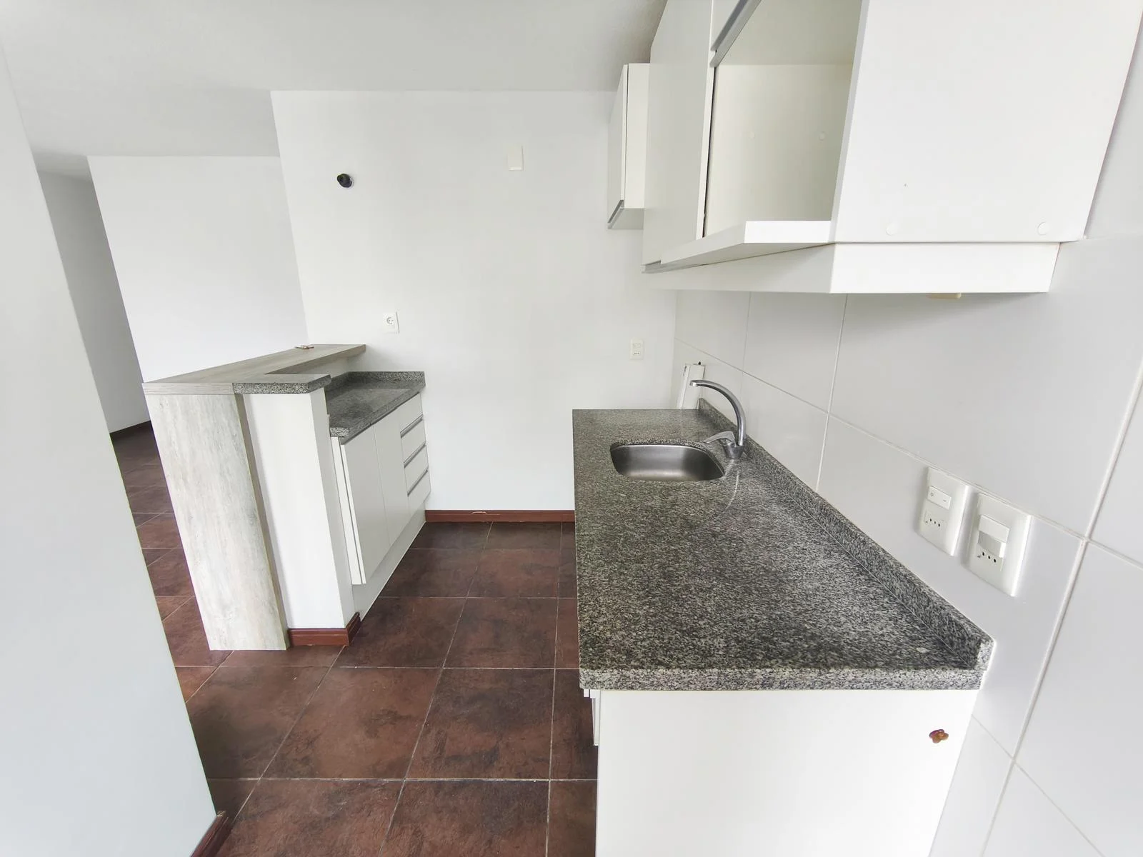 Cocina semi definida con muebles bajo y sobre mesada, barra pasaplatos y terraza lavadero.