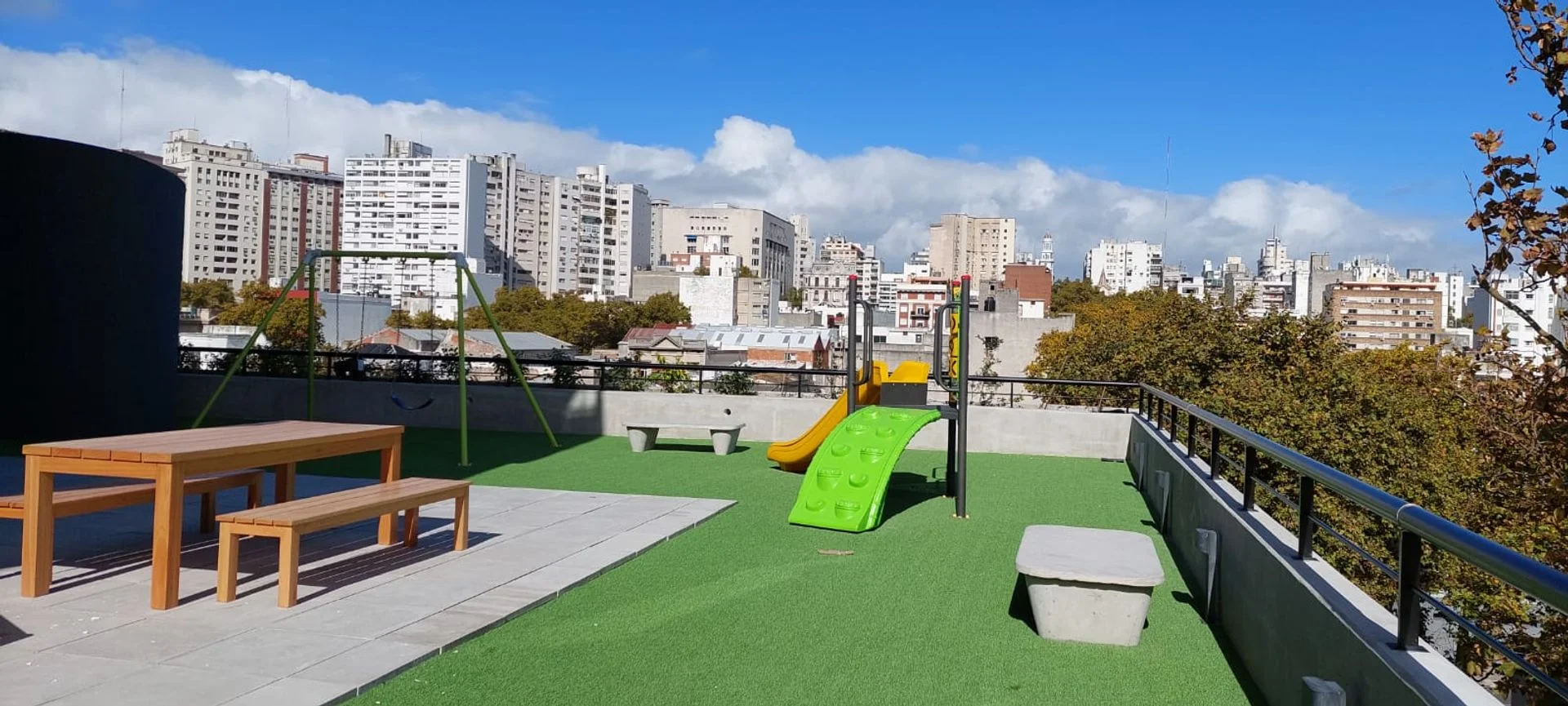 Salón recreativo incluyendo un gran espacio de esparcimiento al aire libre equipado con juegos infantiles y máquinas fitness.