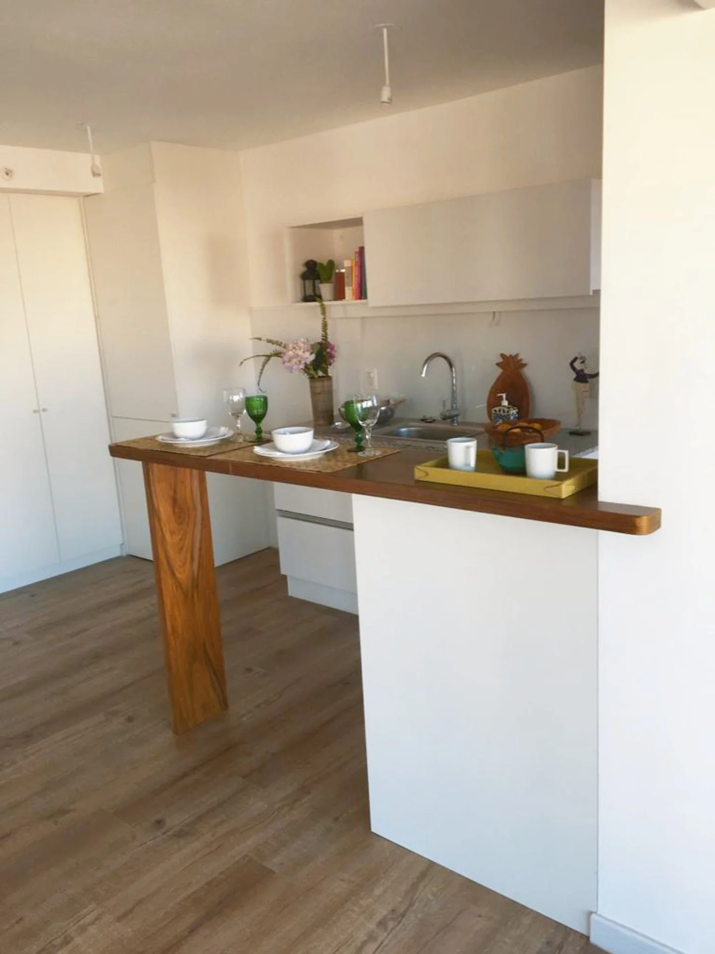 Cocina integrada con gran capacidad de almacenaje, mueble aereo, mueble para calefón y lavarropas, alacena, barra desayunadora con mueble bajo, campana extractora, calefón y salida a terraza de servicio.