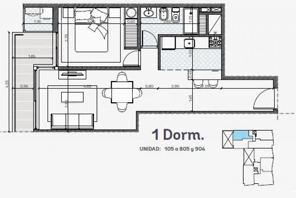Metraje: 105 A 805 Y 904) 65,24m (Area.propia 49,4m + Areas Tzas 7,3m + Area comunes 8,54)