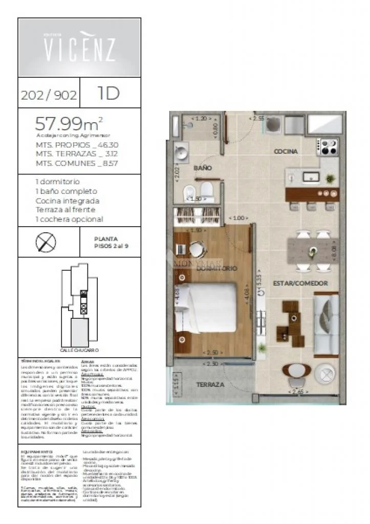 CHUCARRO Y AVENIDA BRASIL....CORAZON DE POCITOS, A MTS. DEL MAR, CON TODOS LOS SERVICIOS ALREDEDOR....VICENZ ES DINAMISMO....IMPECABLE . TOTALMENTE EQUIPADO. Living comedor y 1 DORMITORIO, ambos al frente con salida a TERRAZA, cocina semi integrada, un baño completo. La diferencia la marcan el diseño, las terminaciones y los accesibles SERVICIOS DE CALIDAD PREMIUM: CONCIERGE 24h/365 días, LAVADERO con fichas y ÁREA WIFI. BARBACOA COMPLETA CON TERRAZAS. Calefacción por losa radiante eléctrica con control individual por ambiente. Previsión para aire acondicionado. Pisos de madera natural plastificados semi-mate. Pisos y revestimientos en porcelanato importado calidad premium. Carpintería de madera de alto nivel. Cortinas de enrollar de aluminio en dormitorios. Instalación de gas por cañería. GARAJE PARA 1 AUTO. Gastos comunes aprox. $6000