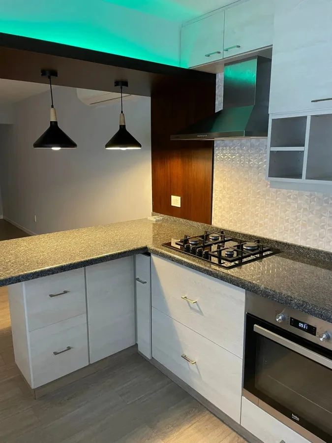 - Cuenta con horno eléctrico empotrado marca Beko y anafe a gas marca Bosch de hierro fundido.