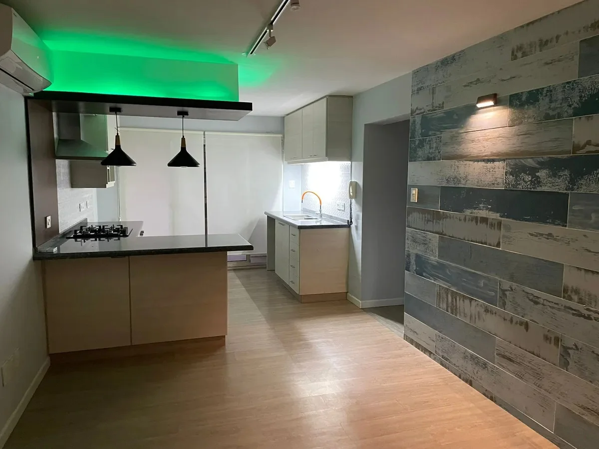 . Cocina integrada con muebles,, barra, horno eléctrico empotrado y anafe a gas