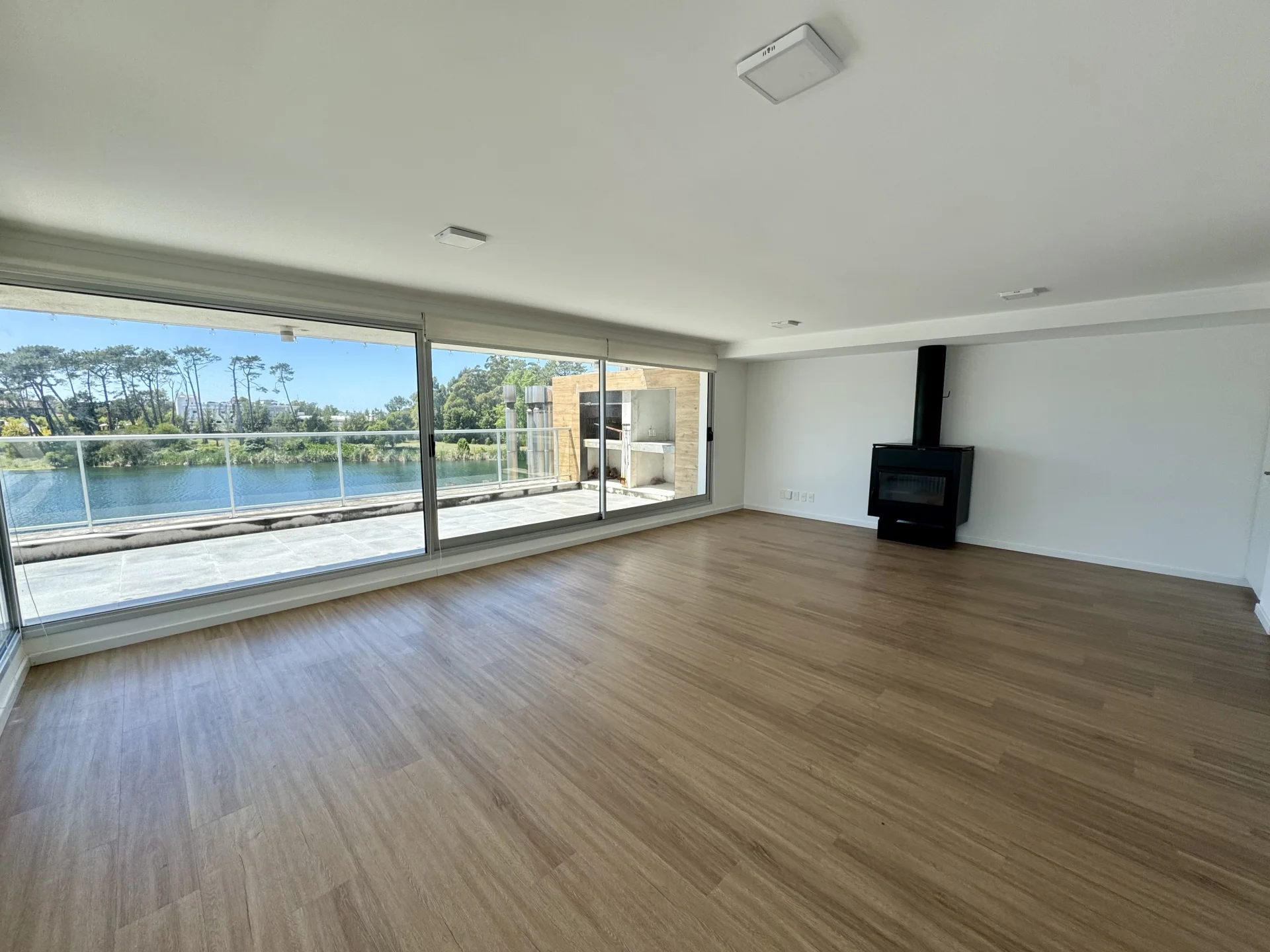 Amplio living comedor con estufa de alto rendimiento y salida a terraza con parrillero. Toilette de visitas.