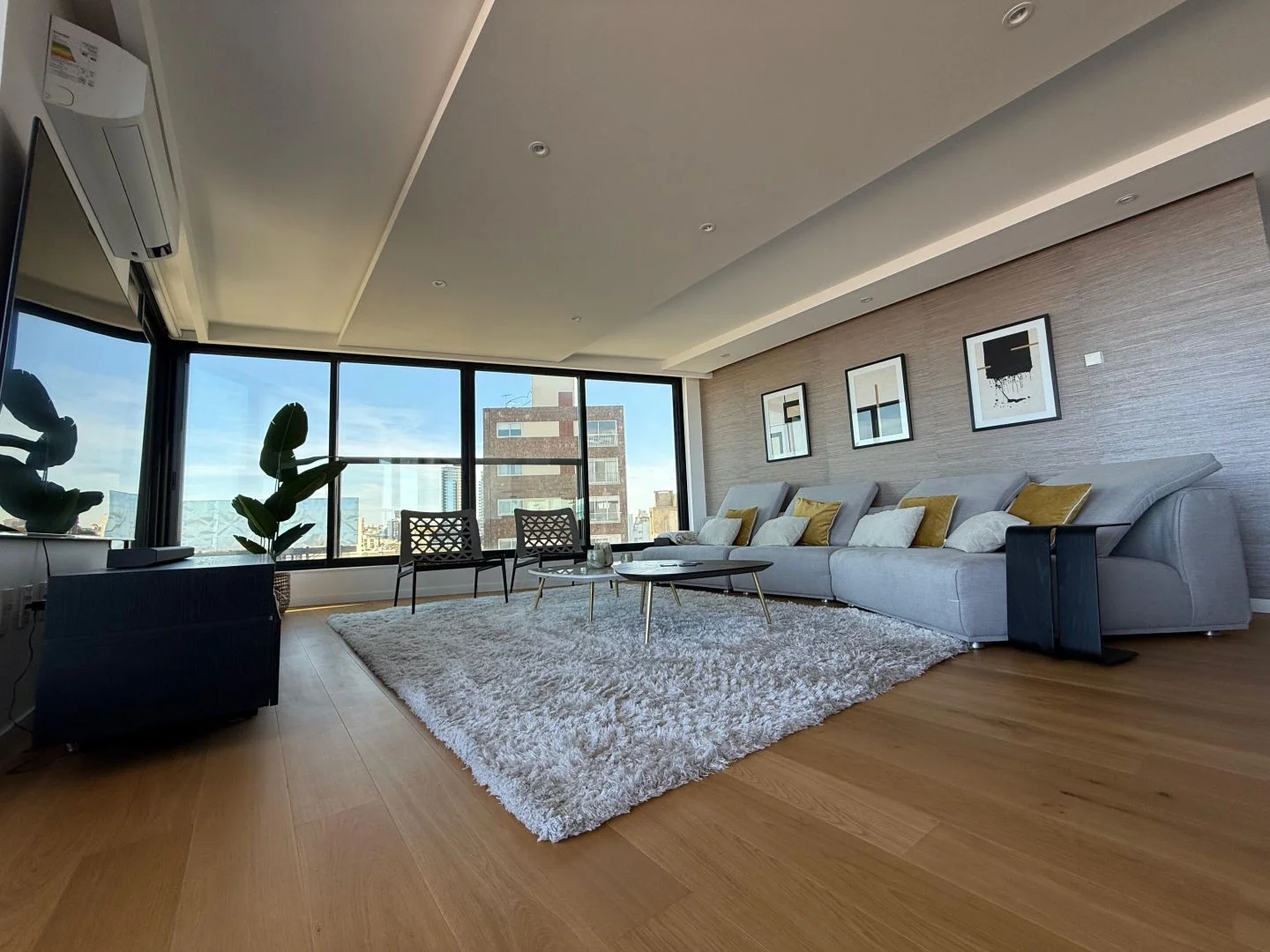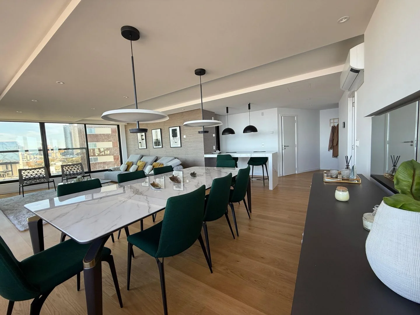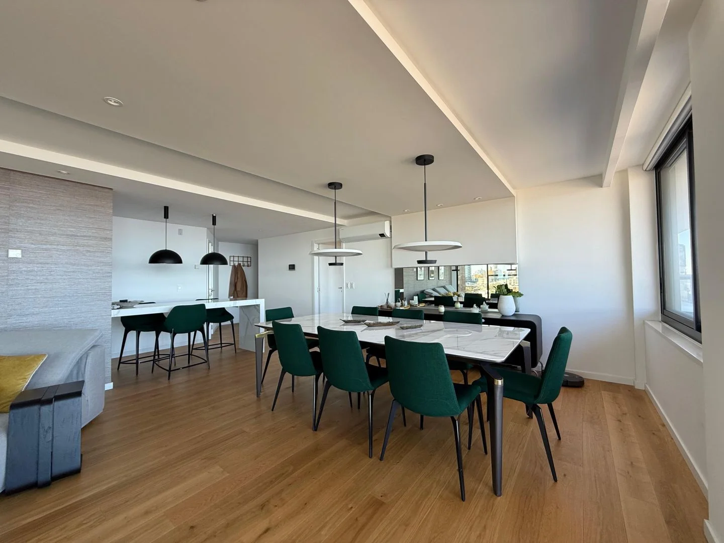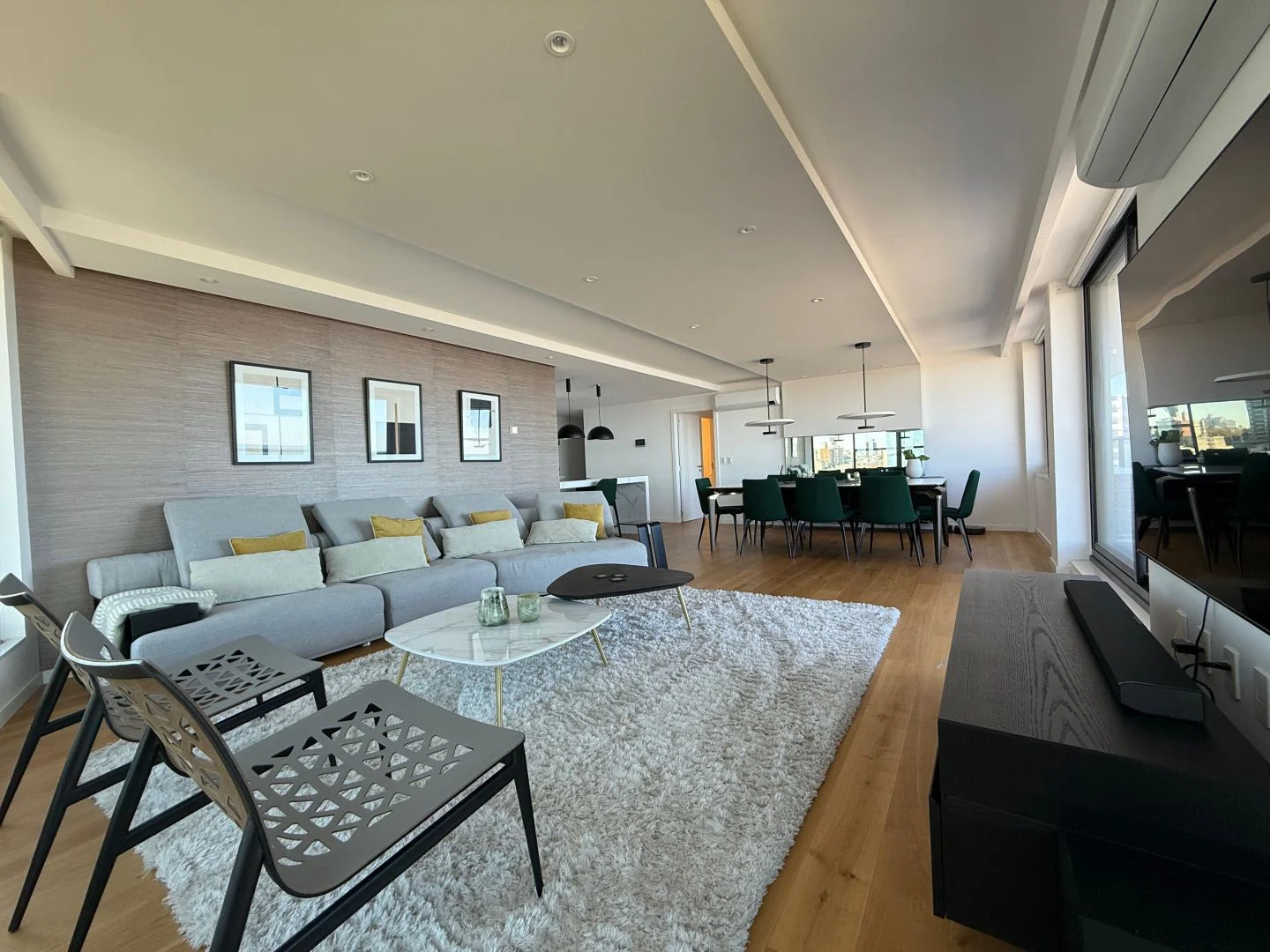 El living ofrece una vista panorámica incomparable de la costa montevideana, desde el Museo Oceanográfico hasta la Isla de las Gaviotas. Un espacio amplio y luminoso, con cortinas automatizadas y blackouts que acompañan tu ritmo de vida.