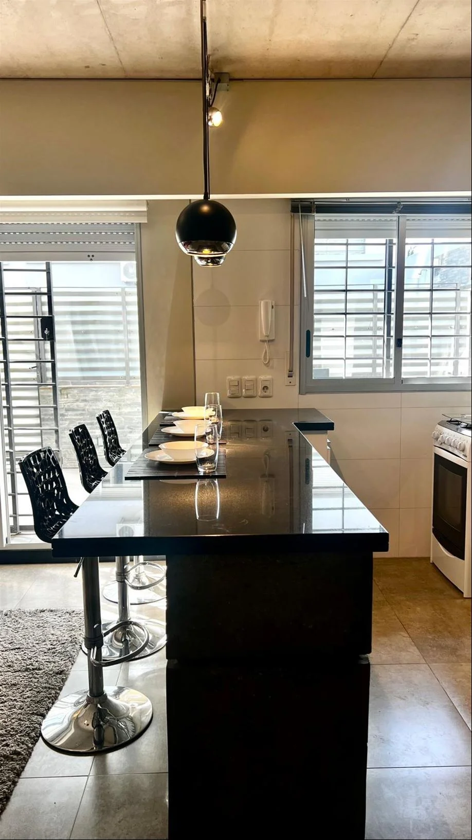 Unidad completamente equipada: espacioso living con cocina integrada y área de escritorio