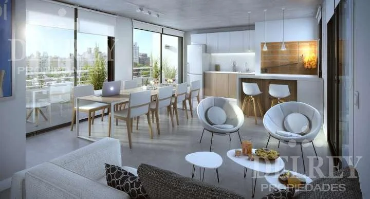 living comedor al frente con ventanales hacia una terraza y mucha luz.