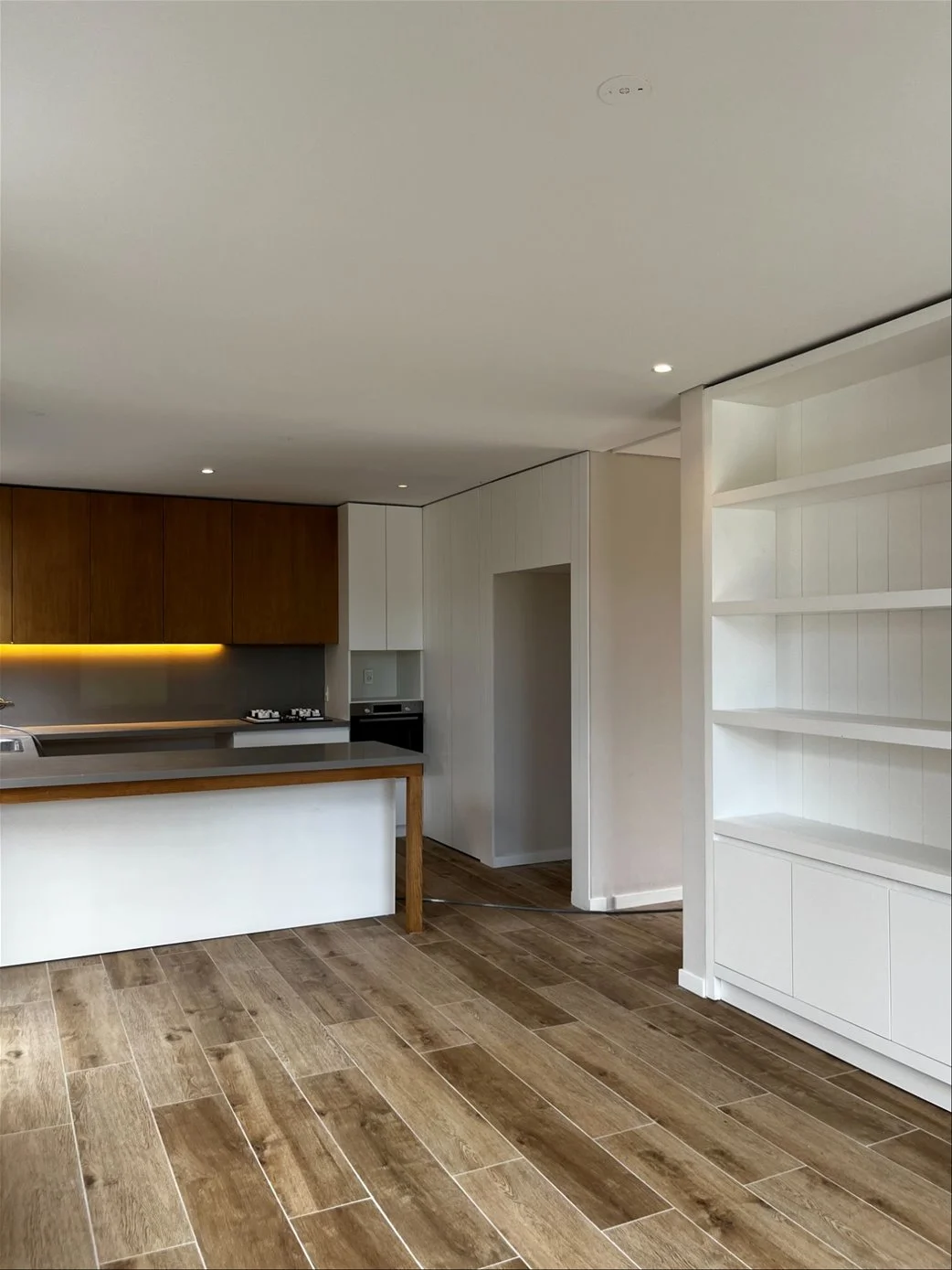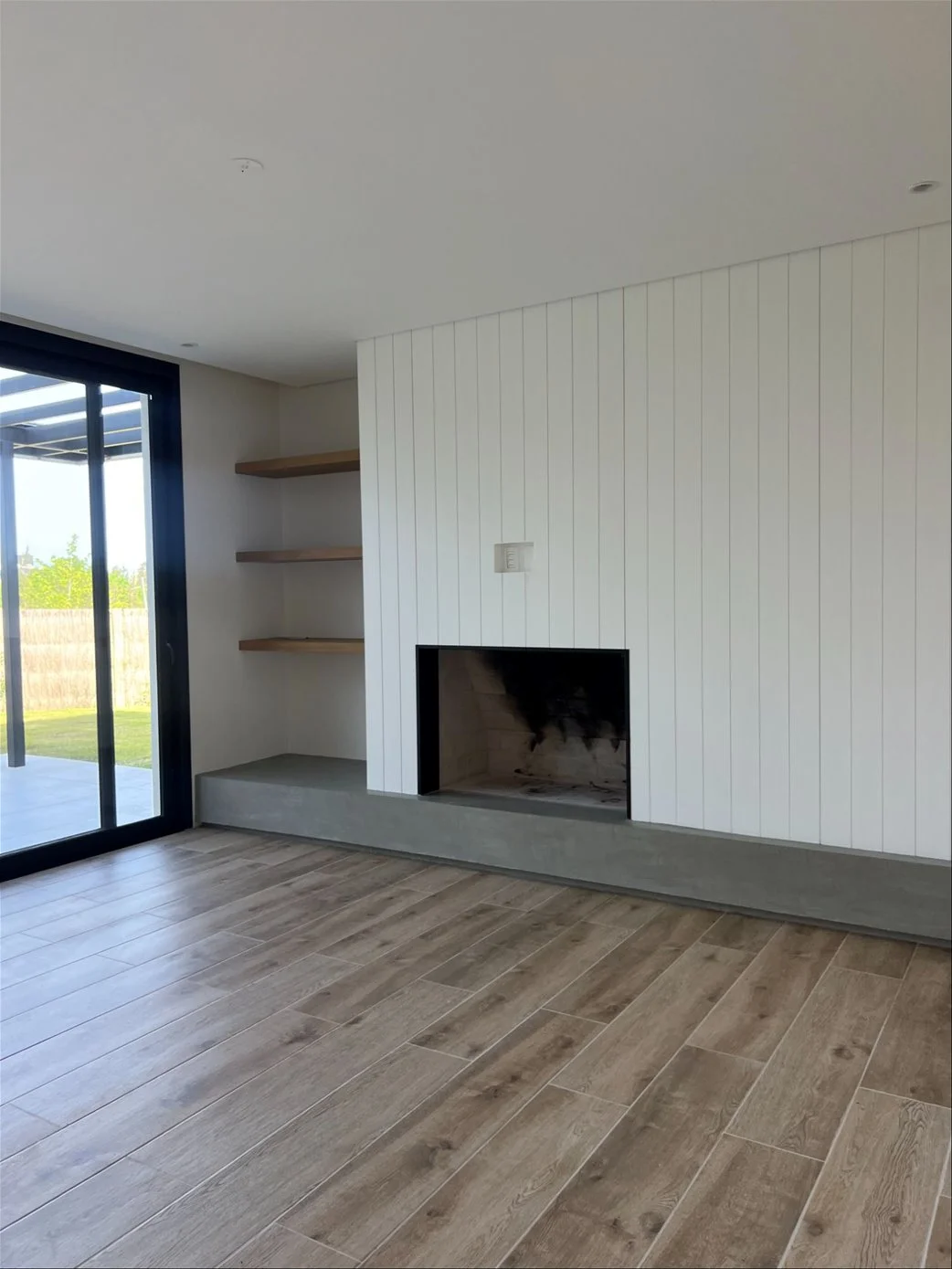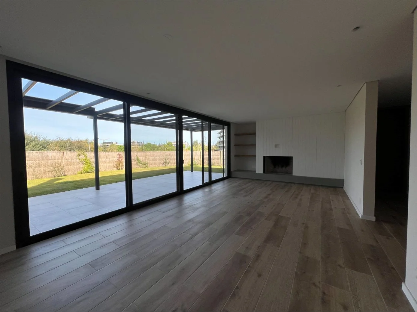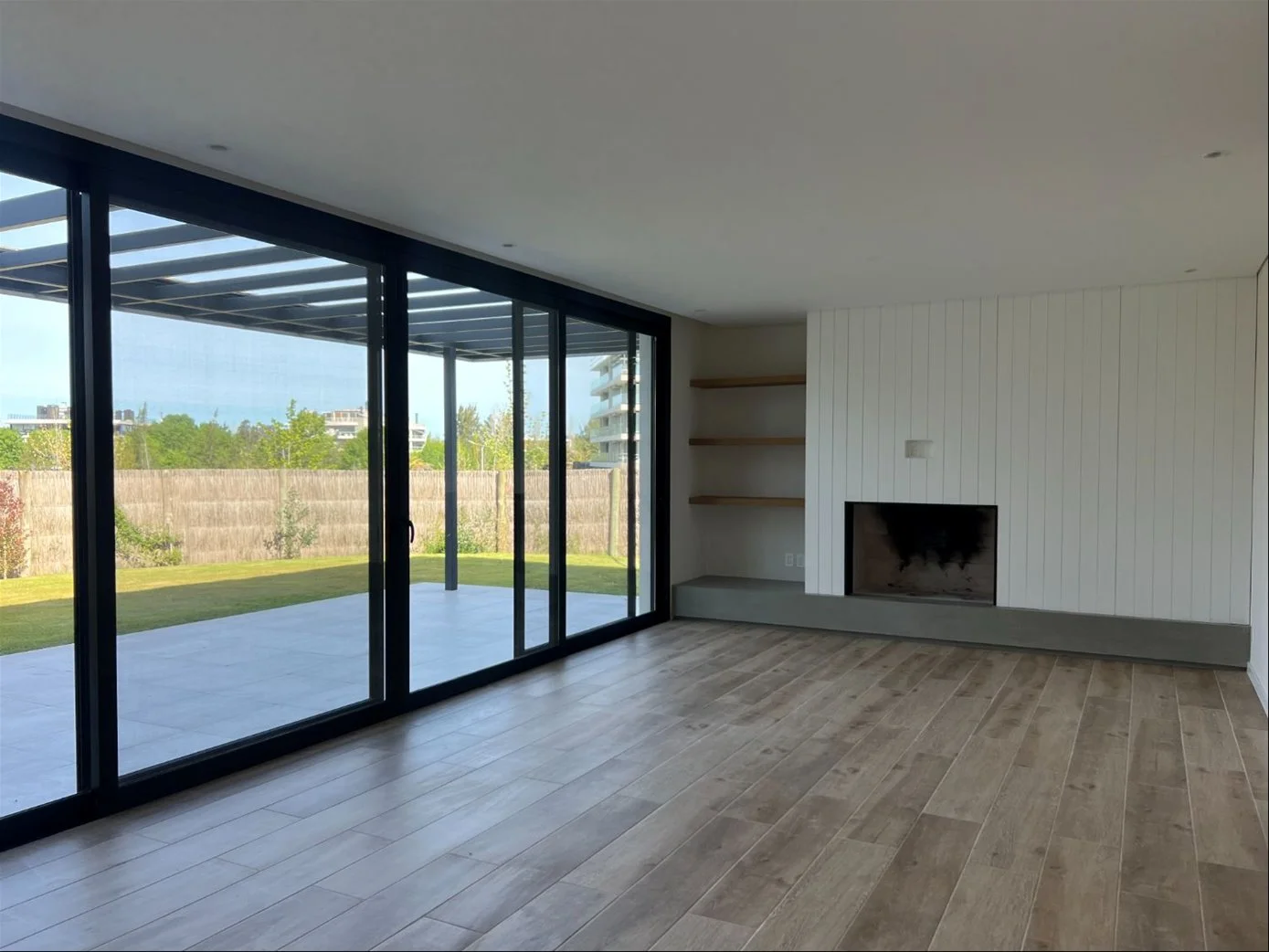 Planta baja: Living comedor con estufa a leña y biblioteca con luces led. Pérgola techada con parrillero y jardín. Cocina completa con estar diario integrado, equipada con horno, anafe y campana. Baño social.