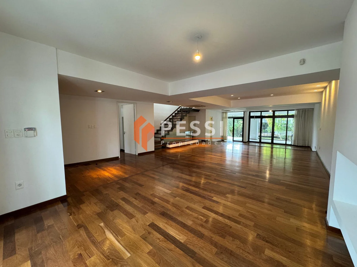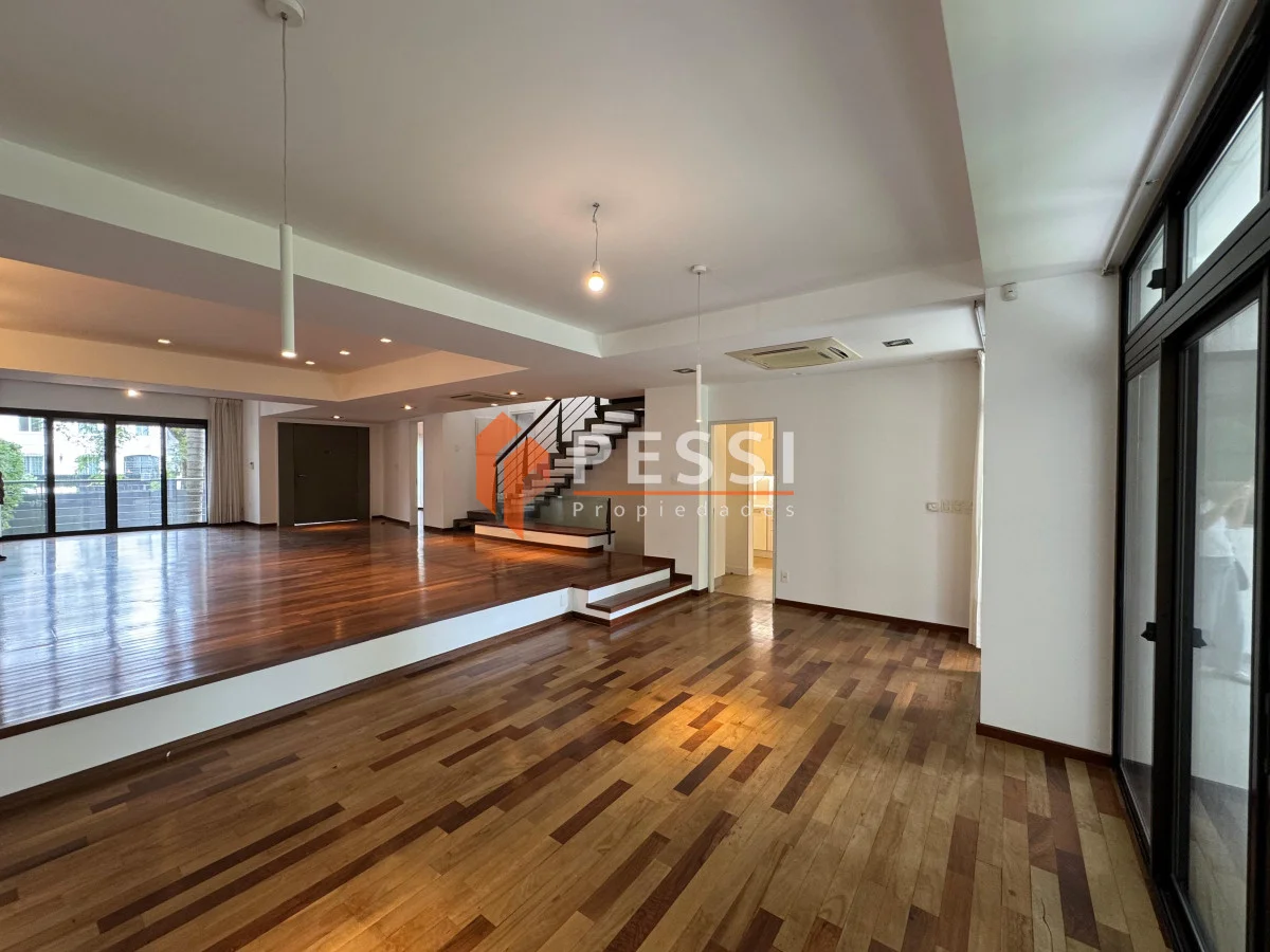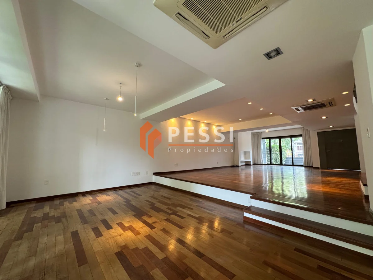 Gran recepción súper luminosa con ventalanes de piso a techo, salida a una galeria techada con cortina-reja motorizada y gran fondo verde.