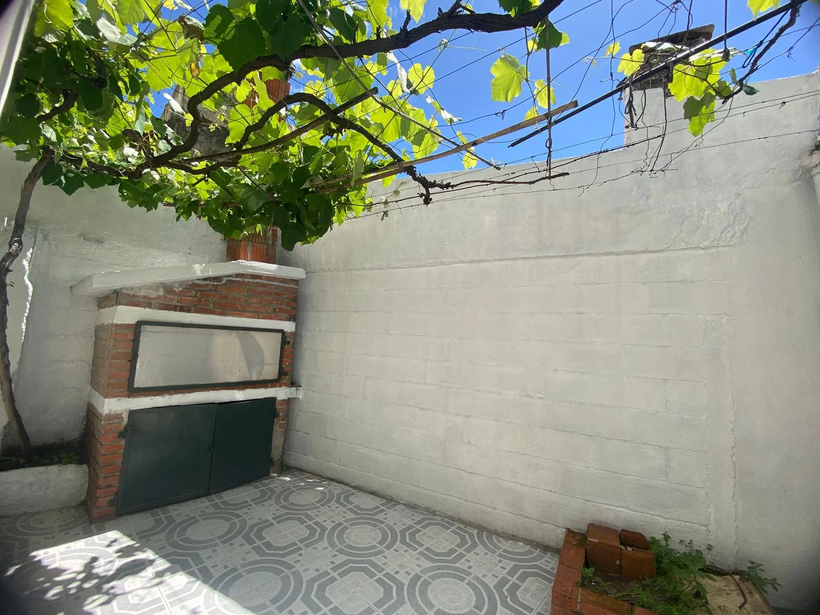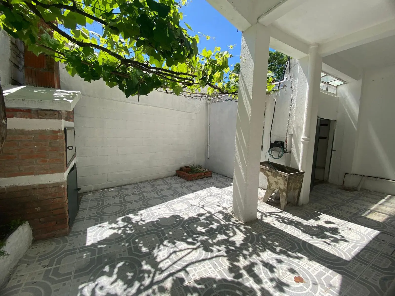 Patio con parrillero y galpón.