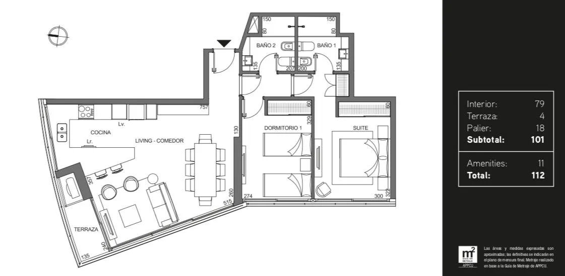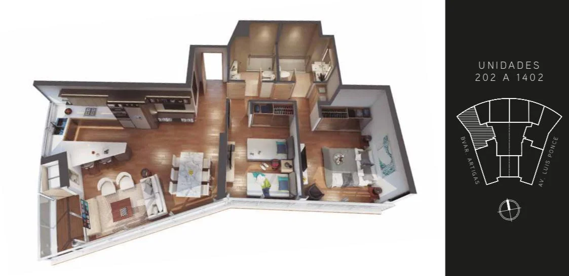Balcón terraza, dormitorio principal en suite con placard, baño completo, y segundo dormitorio con placard y baño completo. Para más comodidad incluye un amplio living comedor con cocina integrada.