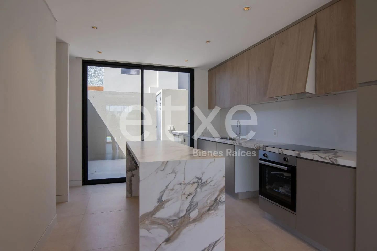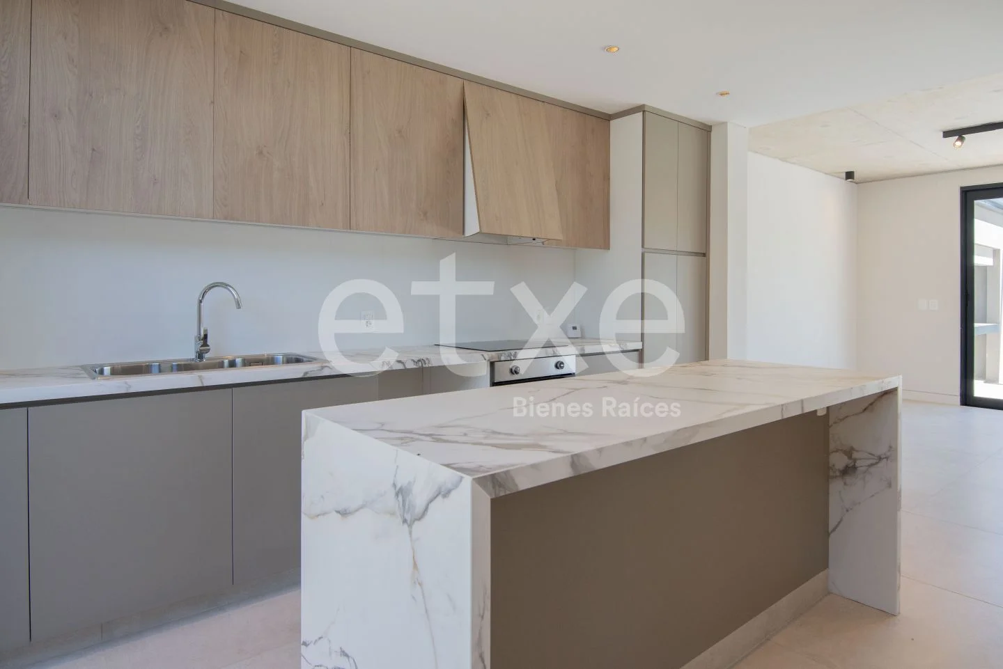 La cocina, semi integrada, cuenta con isla central y equipamiento empotrado (horno, anafe y campana).