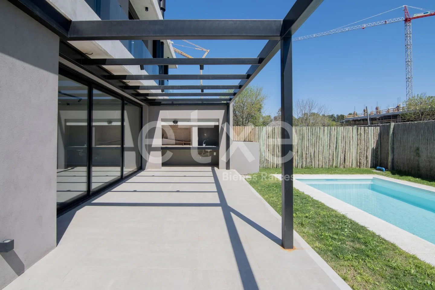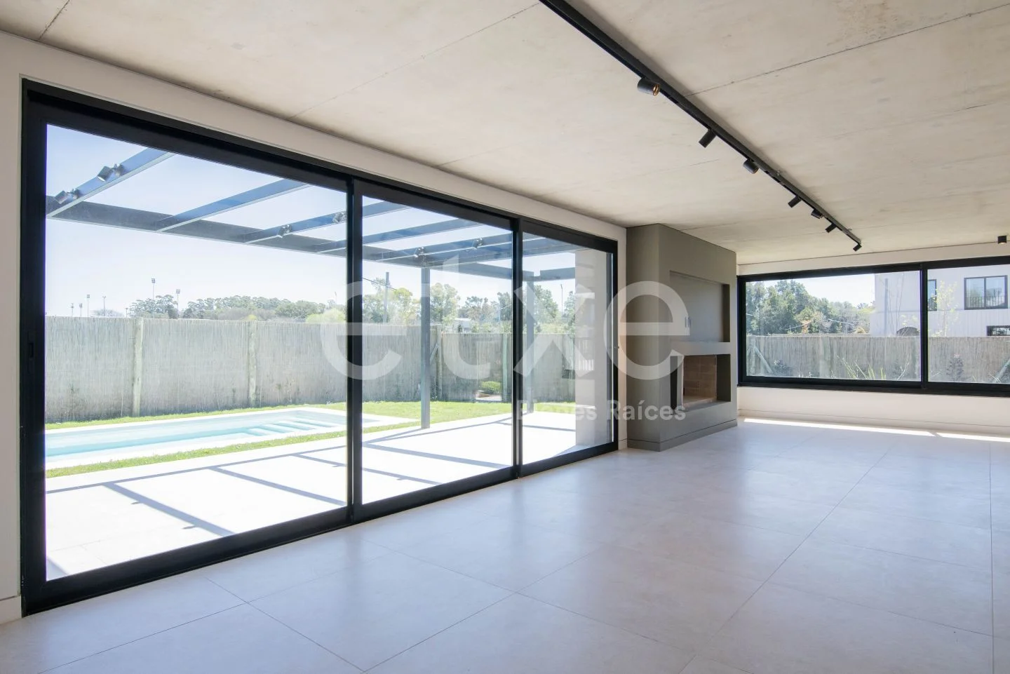 En planta baja, amplio living comedor apaisado con estufa a leña y grandes ventanales que conectan con una pérgola semi techada y el jardín con piscina.