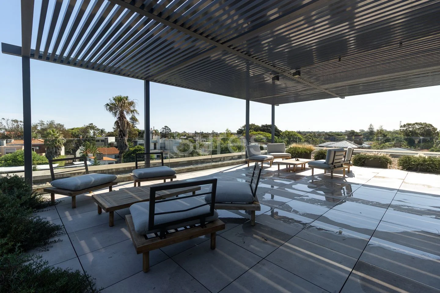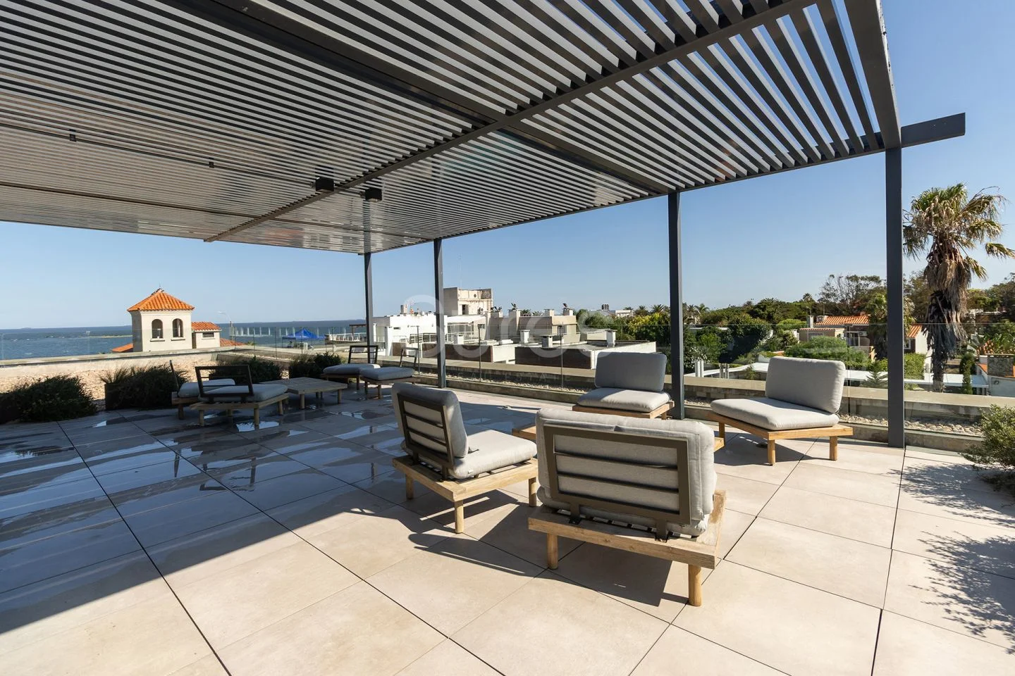 En el rooftop de la torre se encuentra una sala de eventos equipada y con con parrillero, y salida a gran terraza con pérgola exterior y vista privilegiada, un coffee lounge para uso libre de las oficinas con una magnífica terraza con vistas al mar y a los jardines de Carrasco.
