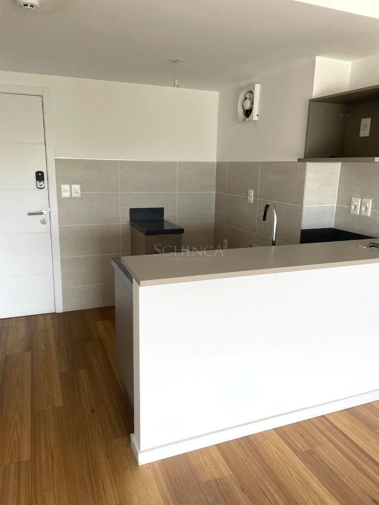 La cocina es integrada, equipada con mobiliario moderno y buenas terminaciones, pensada para un uso diario eficiente. Los pisos símil madera aportan calidez y continuidad estética en los ambientes principales, reforzando la sensación de confort y prolijidad general de la unidad.