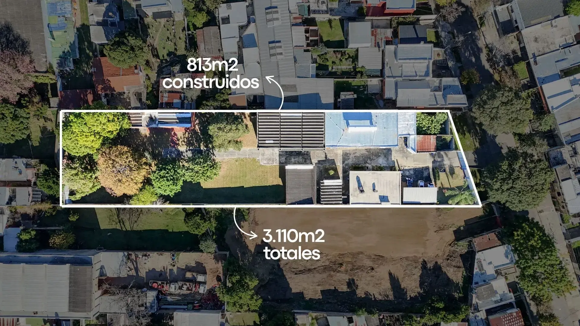 La propiedad cuenta con un terreno de 3.188 m² y 813 m² edificados, distribuidos en varias construcciones que incluyen depósitos, talleres y oficinas.