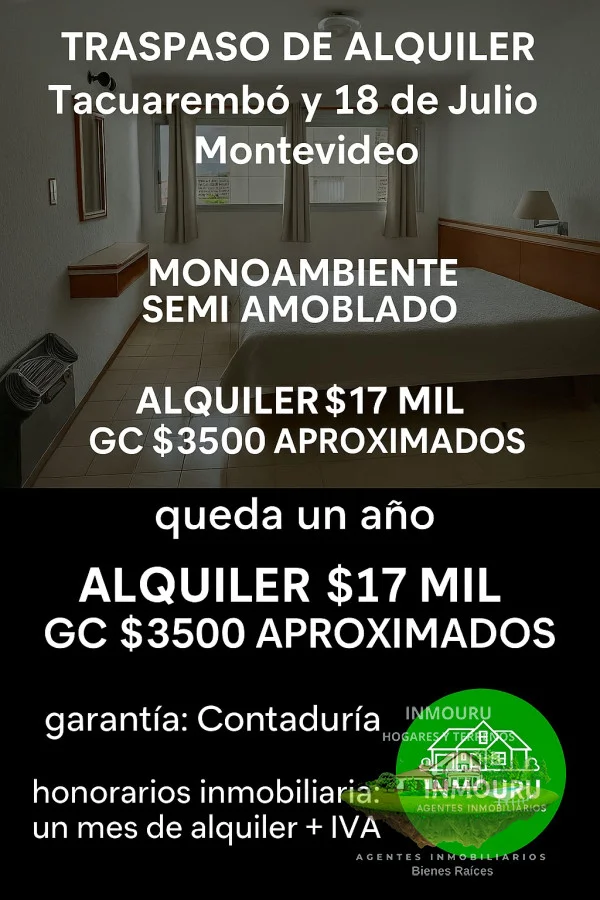 Alquilo Lindo Monoambiente ubicado en el Centro en la calle Tacuarembó y 18 de julio, semi amueblado cuenta dormitorio, cocina defienda y baño con instalación para el lavarropas. muy amplio y ventilado en pleno centro cerca de todo. 17000 mensual Gc: 3500 Garantía: Contaduría Fotos y datos brindados por el Propietario Honorarios Profesionales: un mes de alquiler Agente inmobiliario: Yili Agende su vista para verlo!!! Te esperamos Referencia Interna : Tera-1796