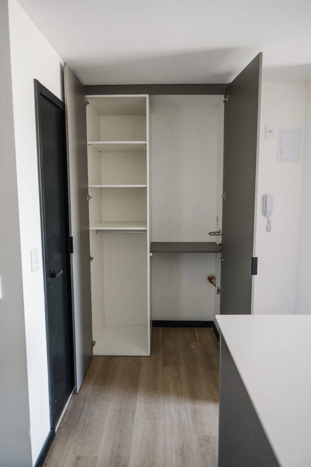 Aire acondicionado en estar-comedor y dormitorio, conexión para lavarropas, mampara y buen espacio de guardado.