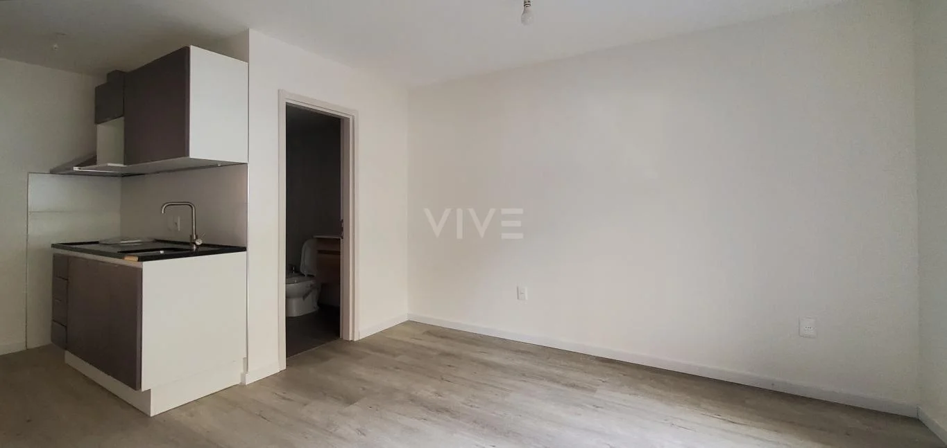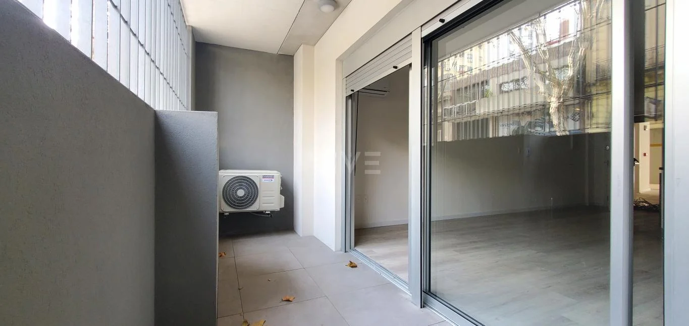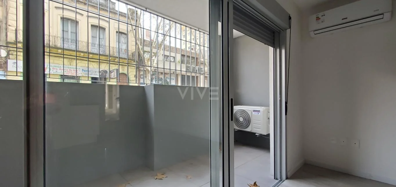 Cómodo apartamento monoambiente en planta baja y al frente con AA y salida a terraza, cocina integrada con campana, barra, luminarias, etc.