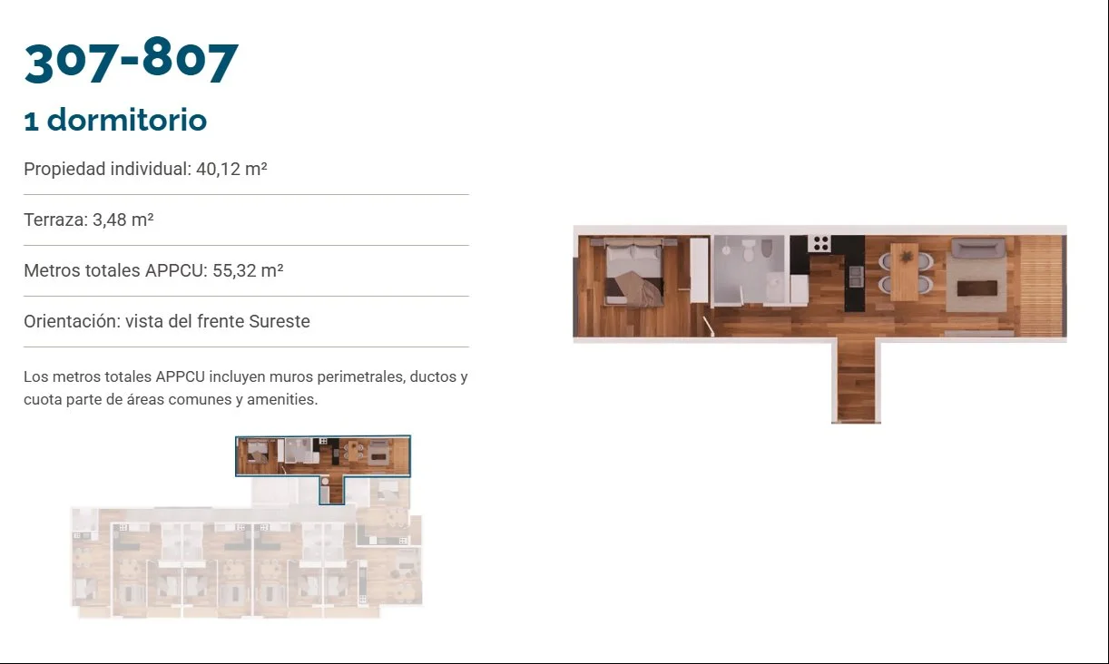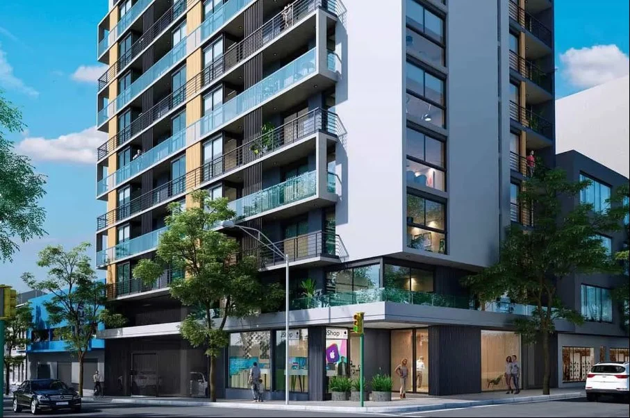 Ofrece monoambientes y apartamentos de 1 dormitorio, todos al frente con terraza propia, garantizando luz natural y vistas despejadas.