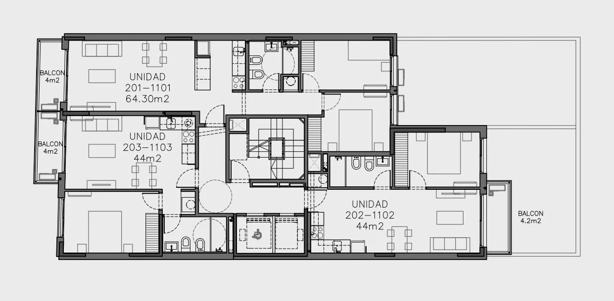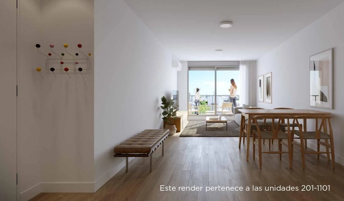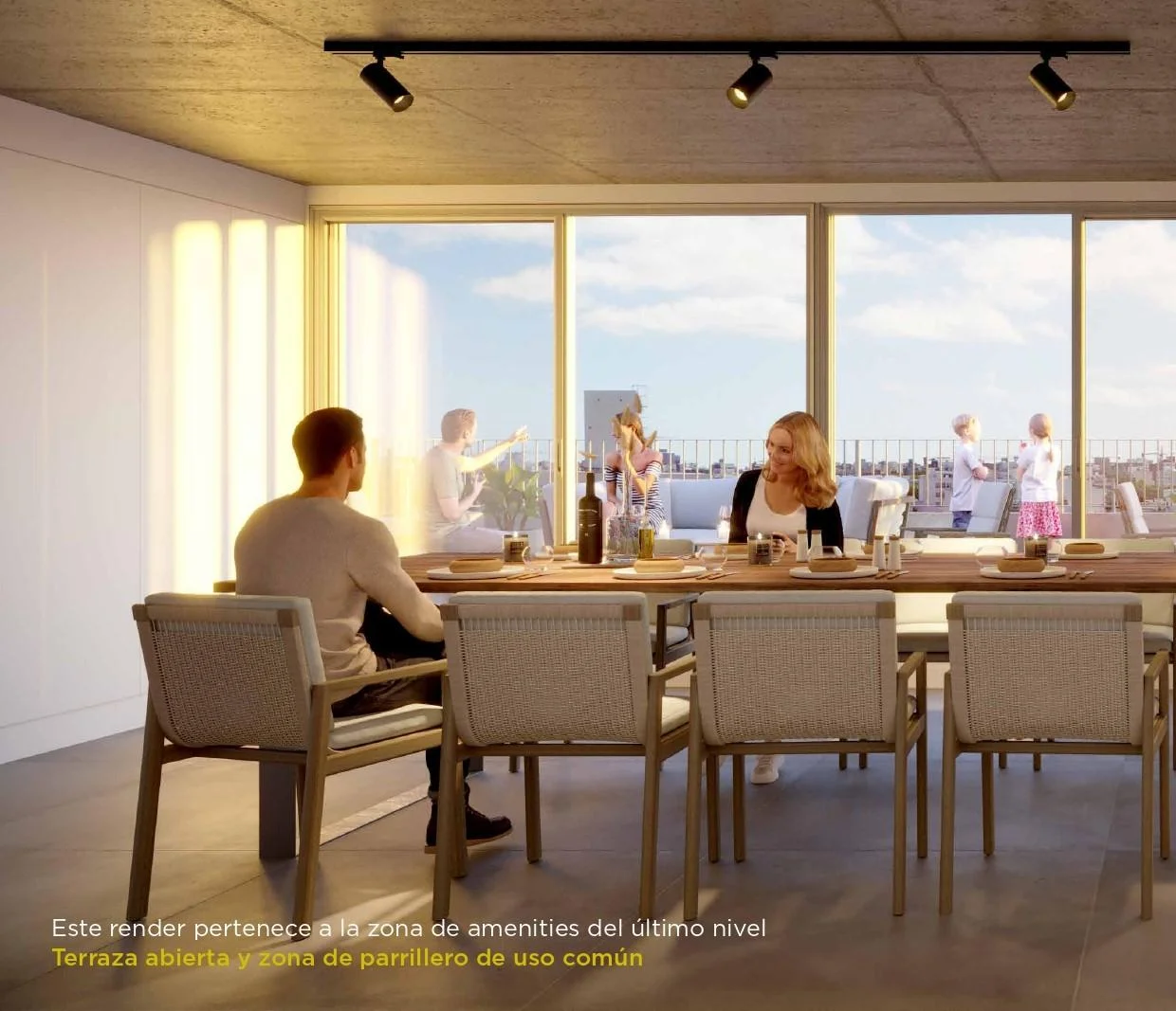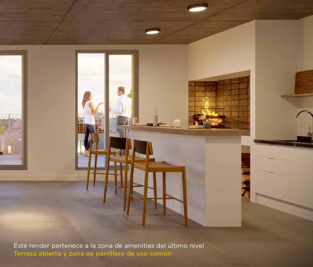 Las unidades cuentan con aberturas de aluminio natural. cuenta con cortinas de enrollar en todos los espacios, puertas de madera con terminación en lámina de PVC blanca. Armarios completos en dormitorios y armario para lavarropas y calefón. Cocina integrada con muebles bajo mesadas y aéreos. Mesada en granito o similar y pileta en acero inoxidable. Revestimientos de porcelanato en baño y cocina. Piso de tablas de vinílico simil madera y zócalo blanco en interiores. Previsión de eléctrica y desagüe para aire acondicionado. Las terrazas dan a la fachada principal. Los amenities se encuentran en la azotea y están conformados por un parrillero cerrado común equipado con mobiliario y servicios, y dos amplias terrazas con excelentes vistas a la ciudad.