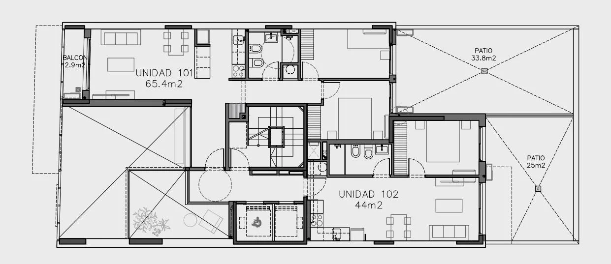 y vistas despejadas. La Planta baja es amplia, con hall de acceso sobre Blvr. José Batlle y Ordóñez, y todas las unidades cuentan con terrazas o patios exclusivos.