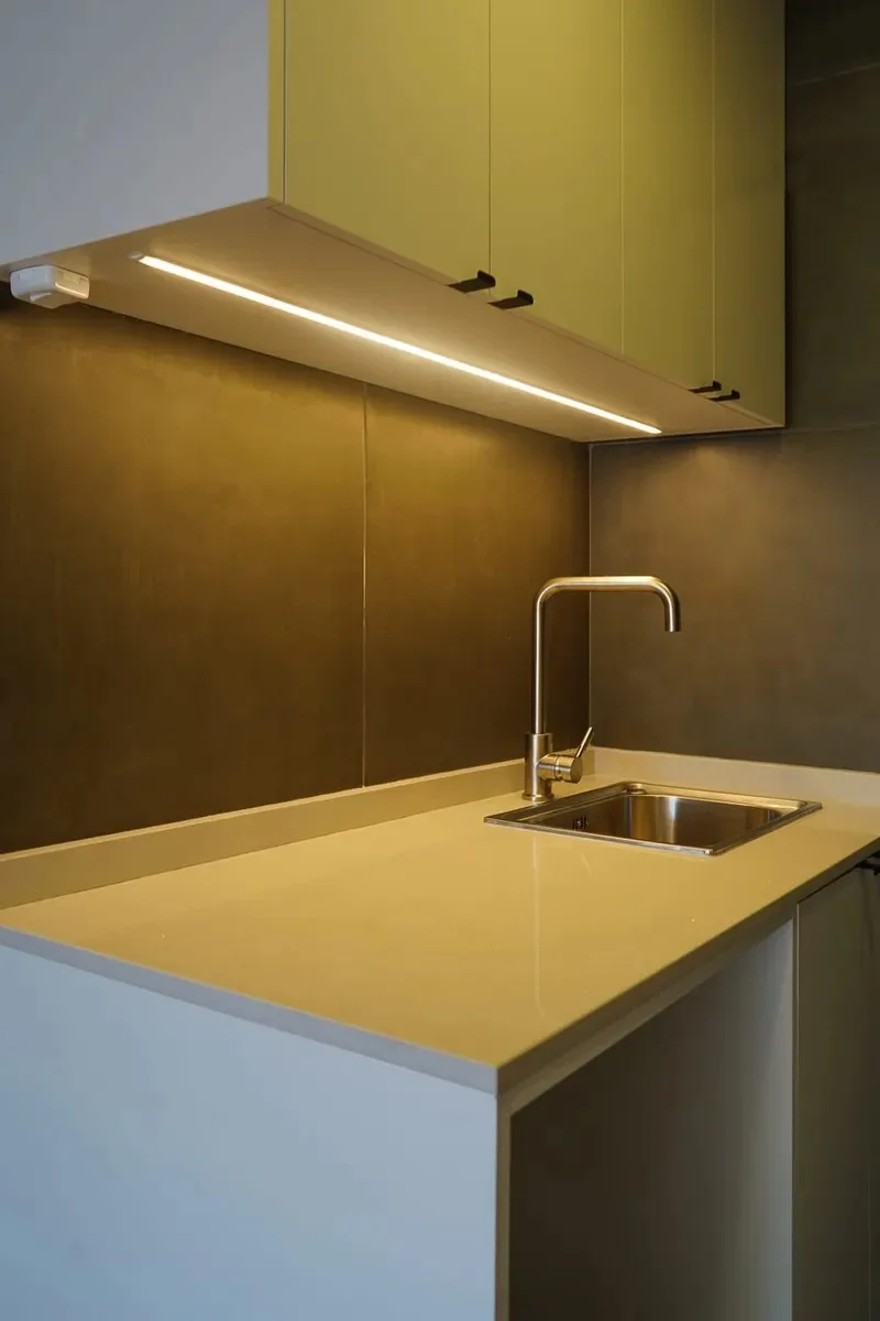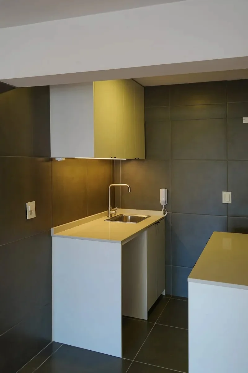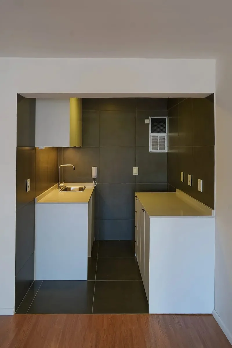 Cocina integrada con doble mesada y placares a medida.