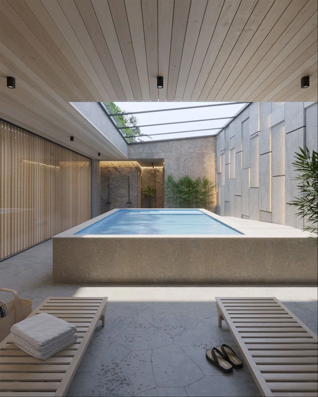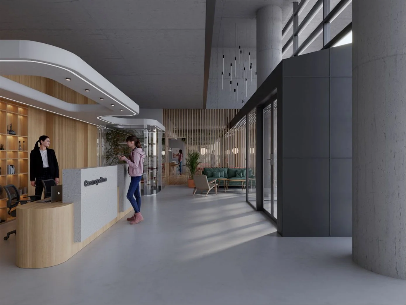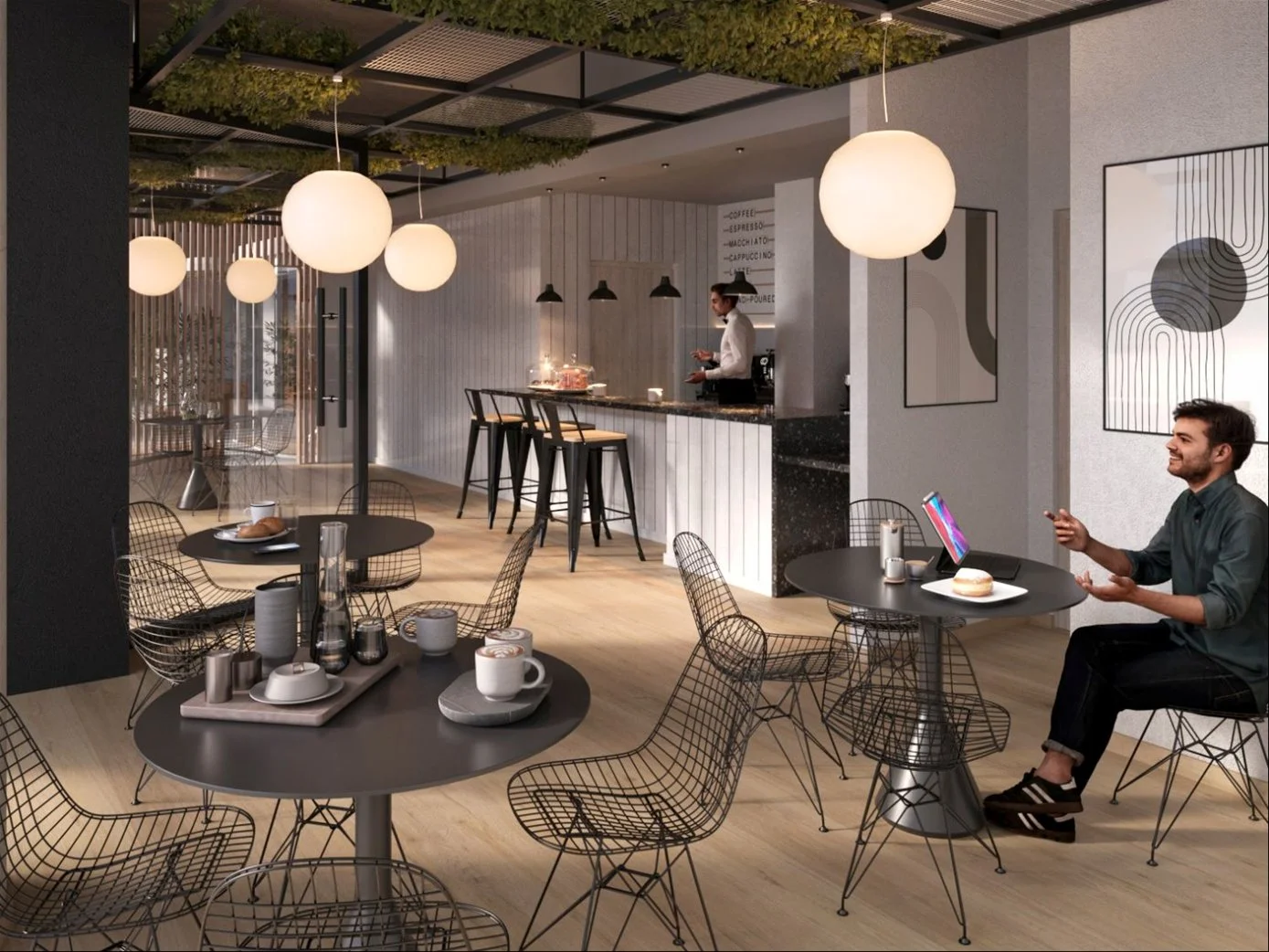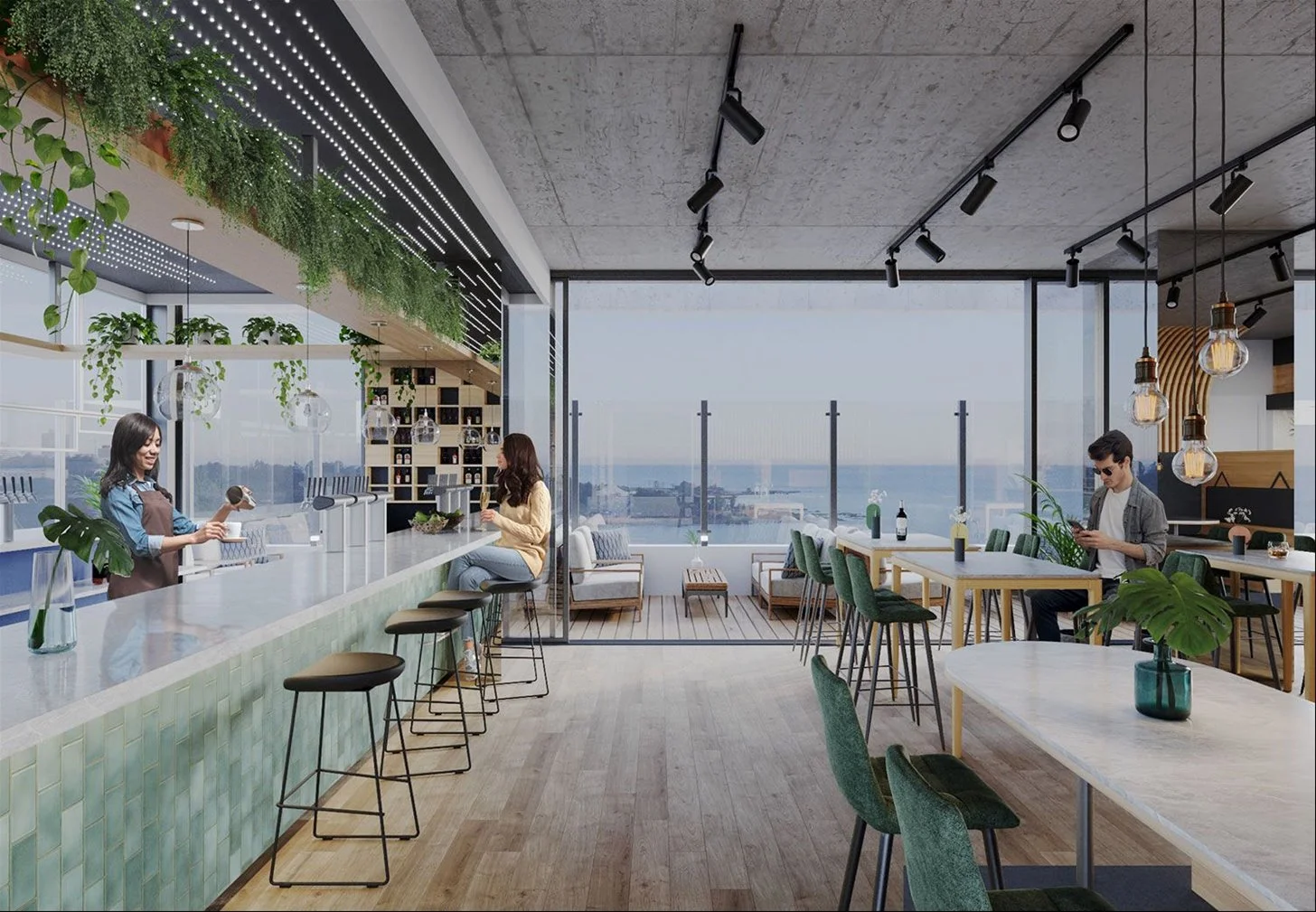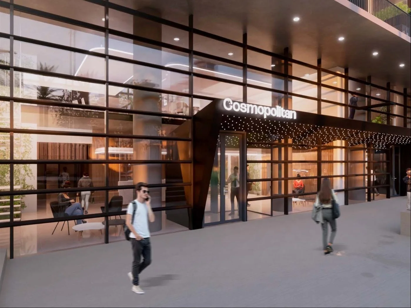 Amenities destacados: Cowork Café, Rooftop Bar, Tech Gym, Spa, Fitness Room, piscina, salas de reuniones y hall de acceso de doble altura con conserjería.