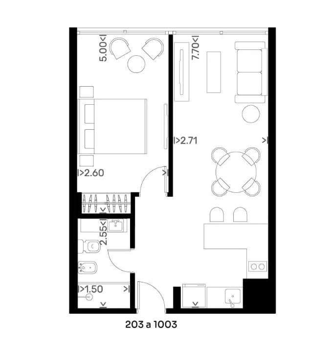 Los apartamentos de 1 y 2 dormitorios presentan una distribución que optimiza cada ambiente, conectando el living, comedor y cocina en un espacio funcional y acogedor.