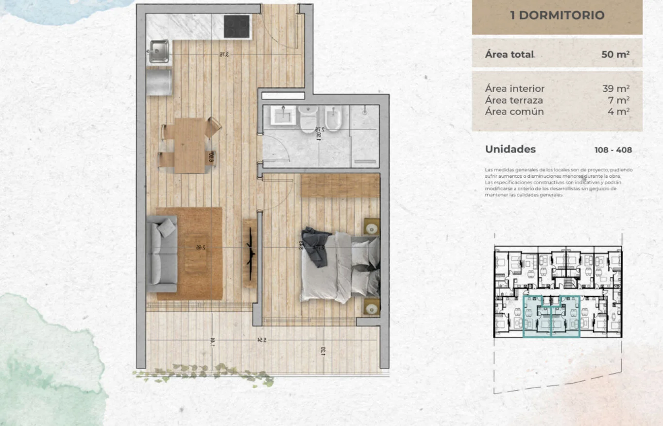 La unidad cuenta con un luminoso living-comedor con salida a terraza, cocina integrada equipada con anafe vitrocerámico y campana extractora, dormitorio con placard y baño completo con finas terminaciones. Los espacios están diseñados para ofrecer confort, eficiencia y estilo contemporáneo.