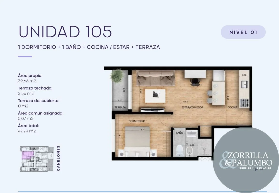 El apartamento cuenta con un dormitorio, un baño, cocina y luminoso living comedor.