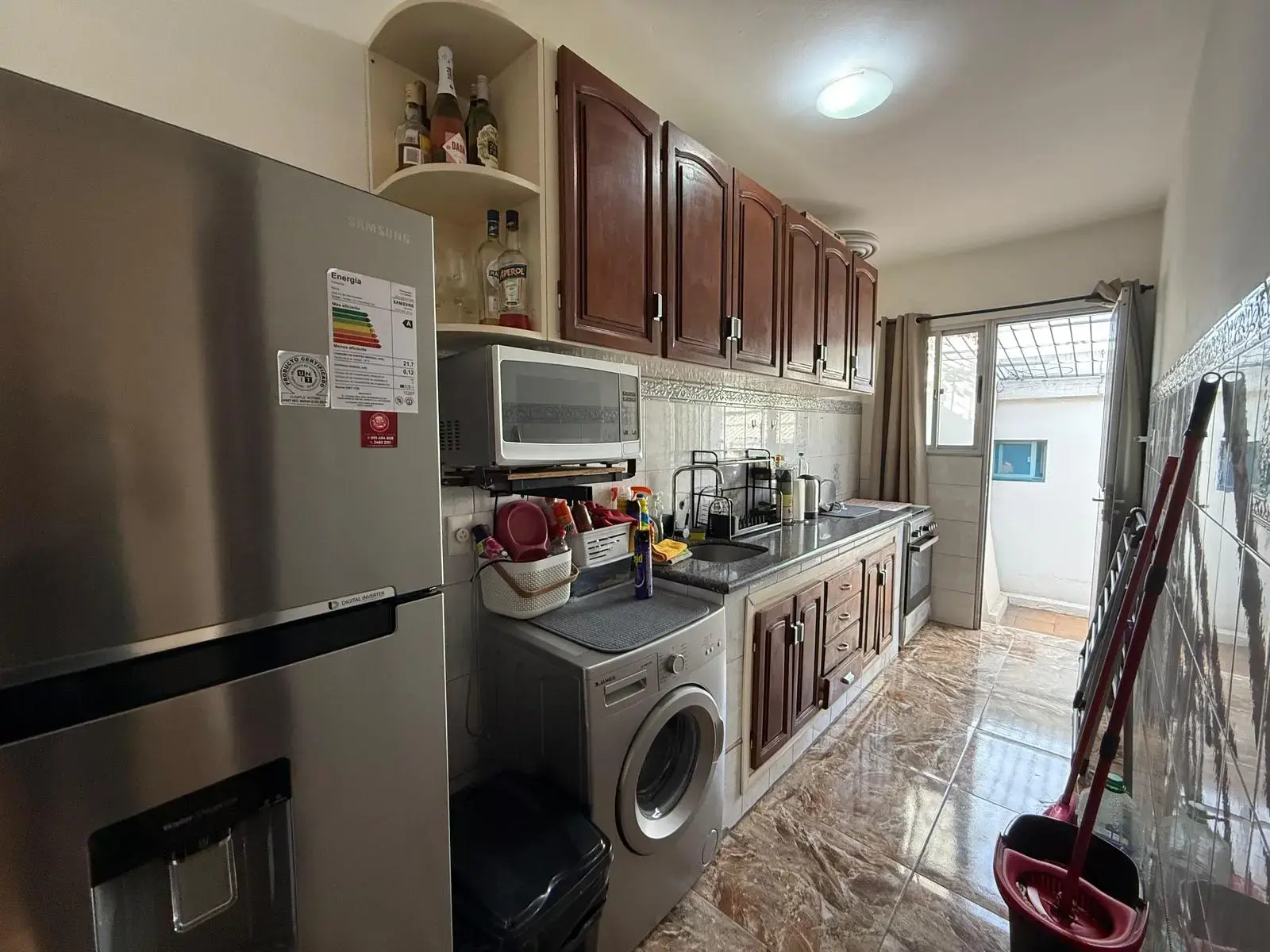 Cocina con ventana y puerta de acceso a patio. Cerramientos de aluminios nuevos; muebles aéreos y bajo mesada en madera, en muy buen estado y muy buena calidad. Mesada de granito negro; grifería monocomando, con instalación para agua fría y caliente. Piso y paredes con cerámicas nuevas de muy buena calidad y estado. Instalación eléctrica pronta para heladera, lavarropas, microondas y cocina.