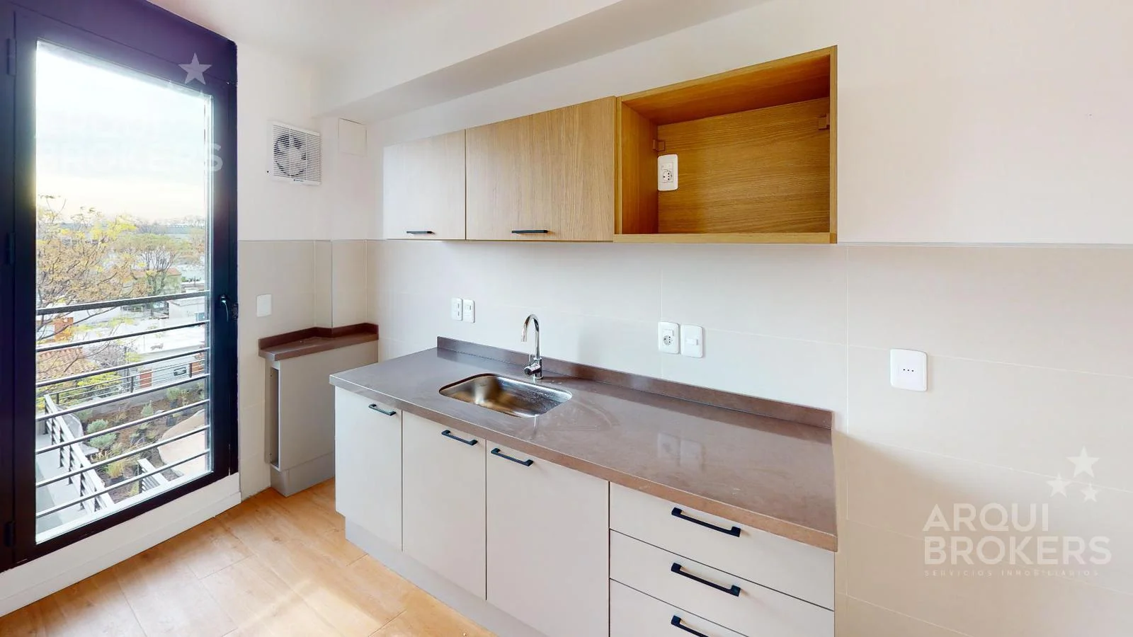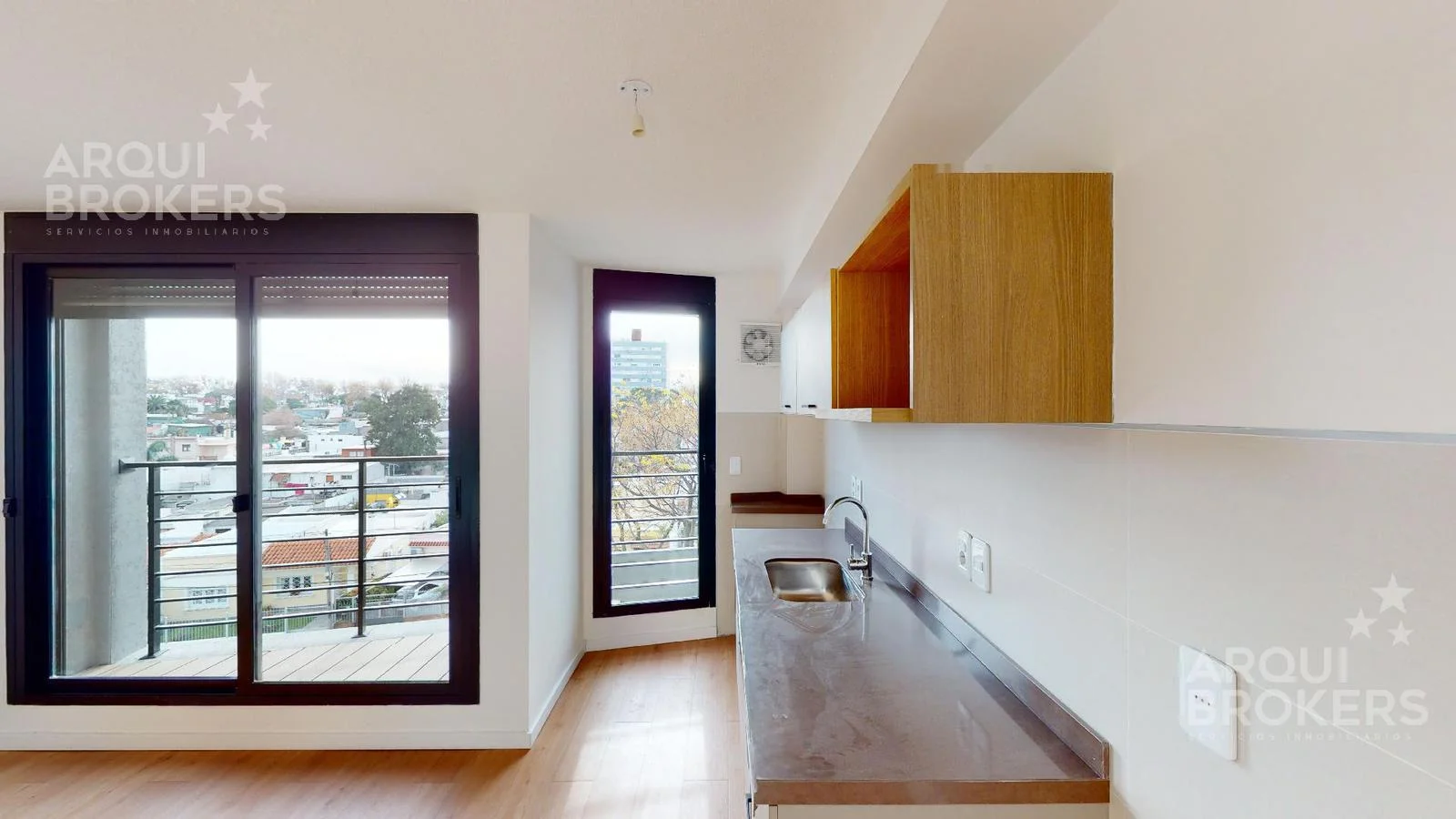 Living comedor con salida a terraza al frente y cocina integrada, 2 dormitorios y 1 baño.