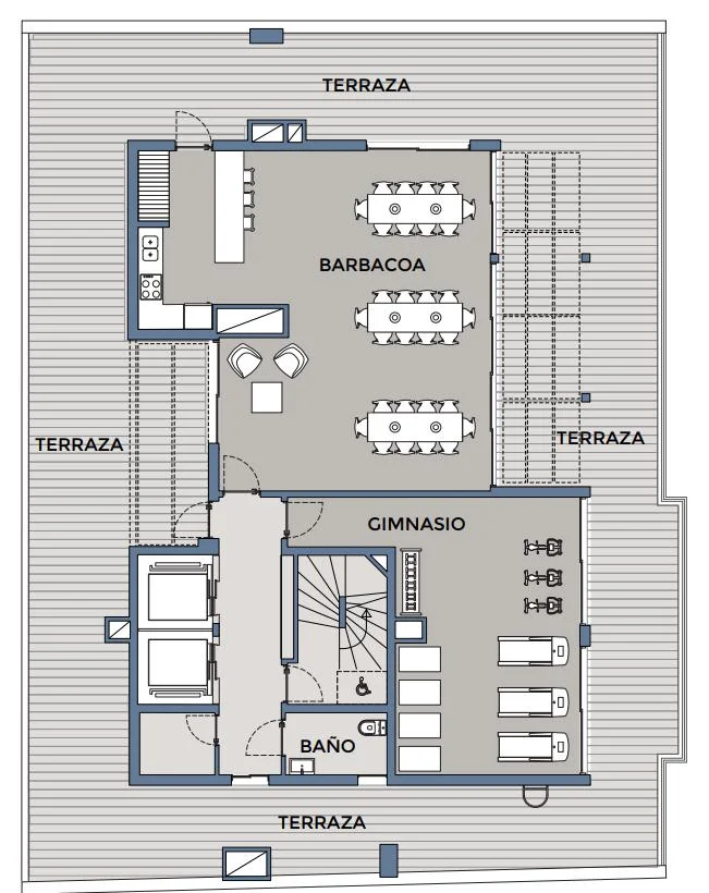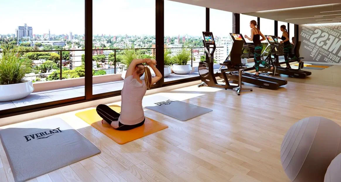 Las vistas 360º al skyline de Montevideo se pueden disfrutar al subir al piso 11, desde la barbacoa o mientras te ejercitás en el gimnasio.