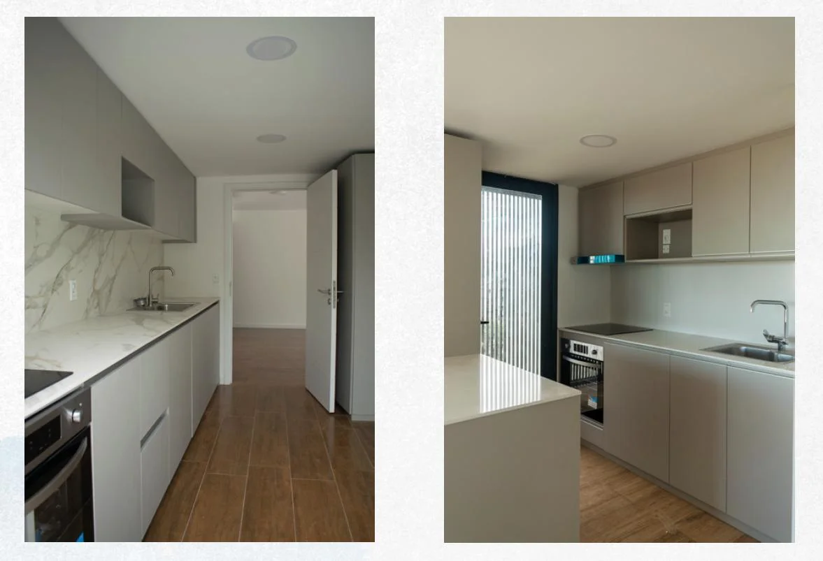 Las cocinas contarán con placares sobre y bajo mesada en melamina, el equipamiento se completa con electrodomésticos ya instalados: anafes eléctricos, extractor con campana en cocina, extractores en baños y termotanques eléctricos.