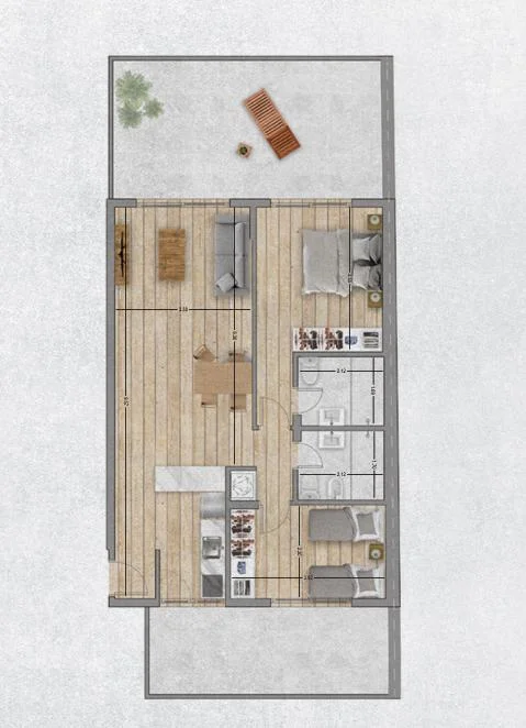 Se desarrolla en 4 niveles con un diseño moderno y funcional. En planta baja se ubican las cocheras, mientras que los niveles 1, 2 y 3 se encontrarán las unidades de 1 y 2 dormitorios, completando un total de 24 unidades. En la azotea, los residentes podrán disfrutar de un espectacular rooftop con parrillero y solárium.