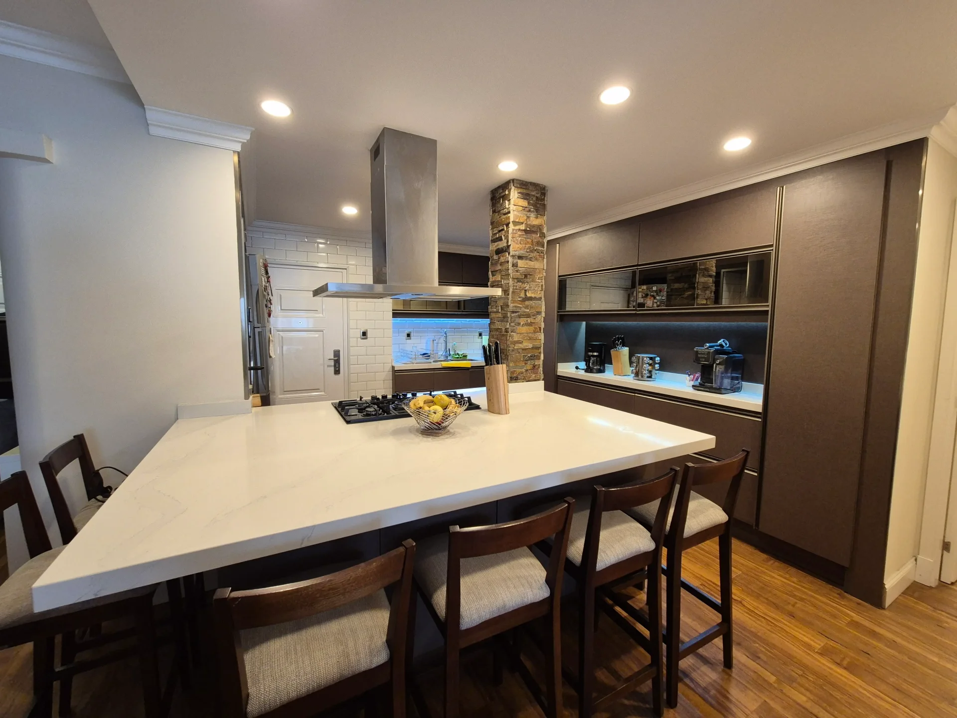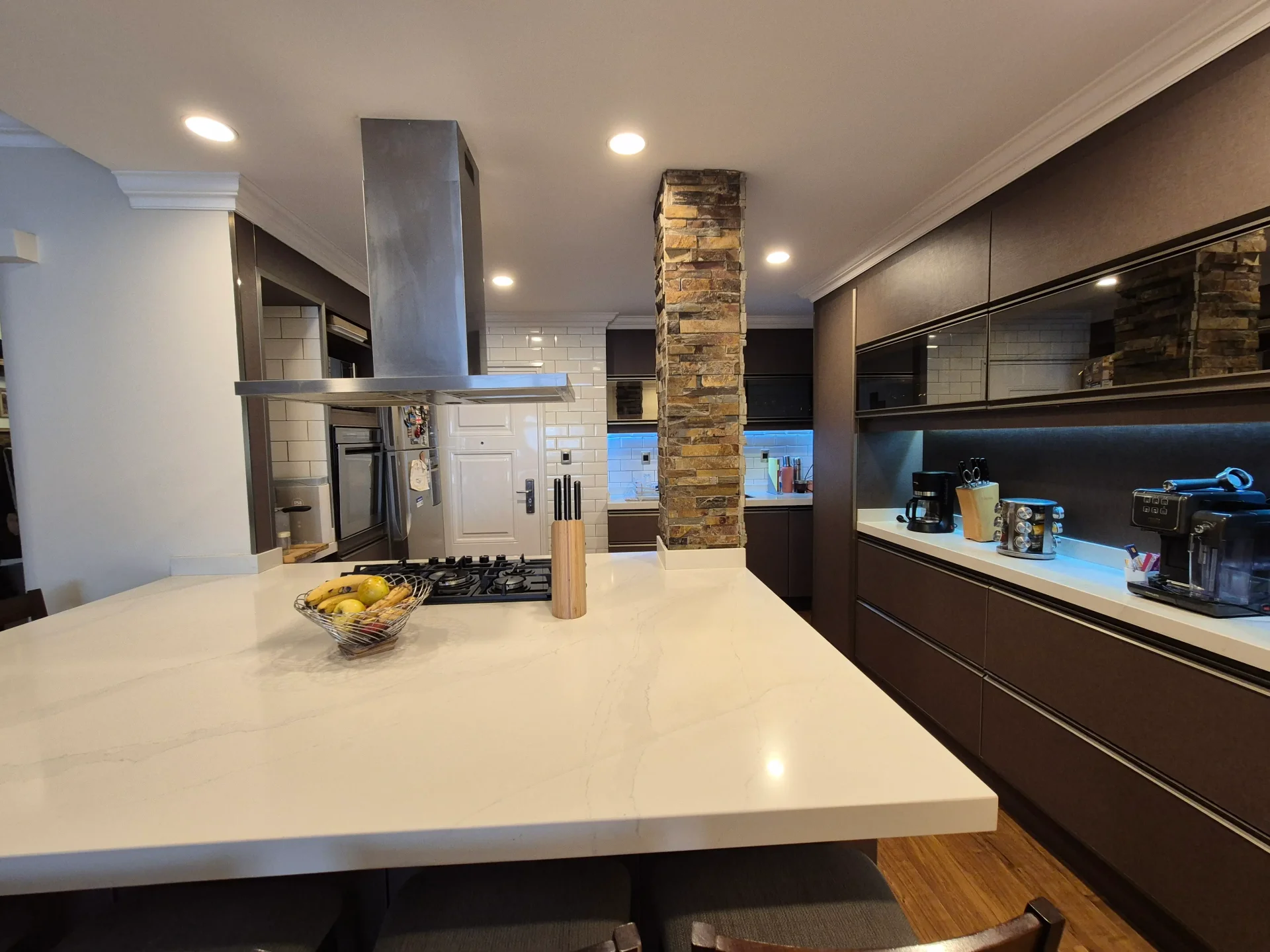 Cocina integrada con buenos placares y mucho lugar de guardado, Amplia isla en el centro con anafe.
