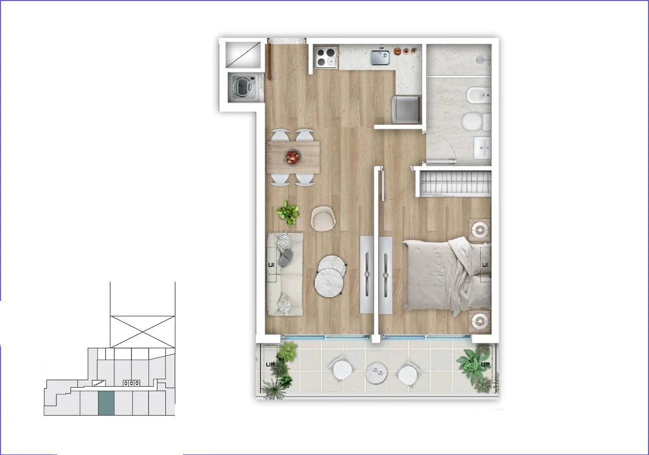 Living comedor con terraza al frente, cocina integrada con placares, 1 dormitorio, 1 baño.