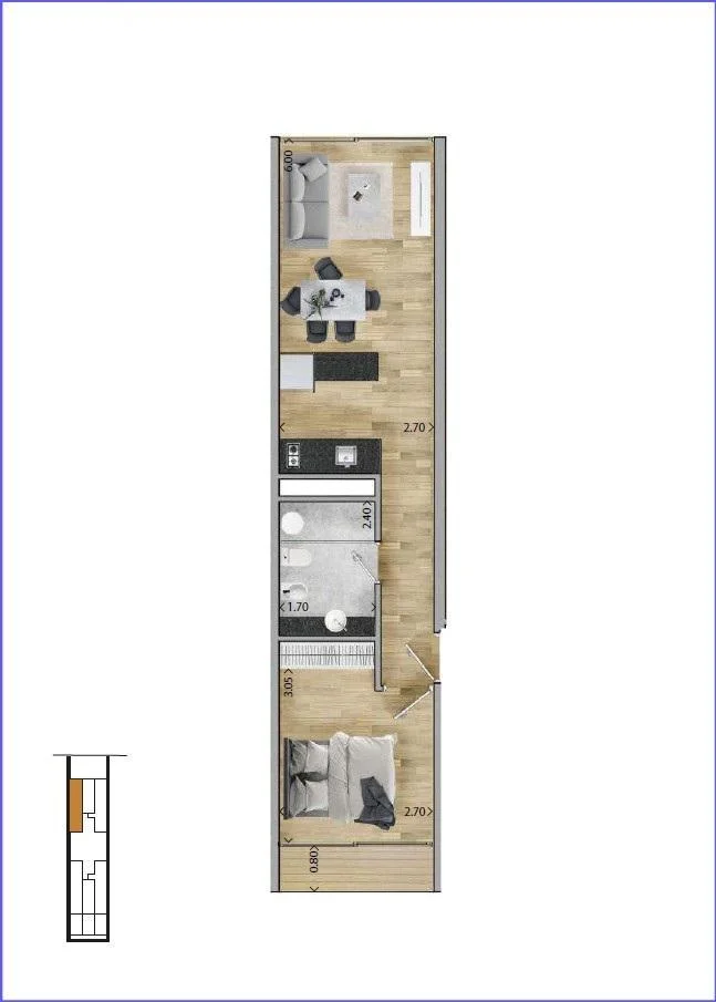 Living comedor con cocina integrada con placares, anafe vitrocerámico, horno eléctrico, extractor y termotanque, 1 dormitorio con placard y terraza, 1 baño completo con extractor.