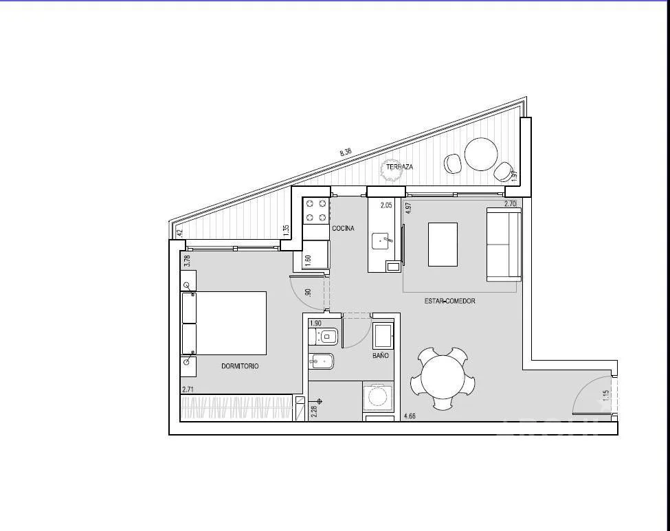 Living comedor con terraza al frente, cocina integrada con placares y conexión para lavarropas y campana. 1 dormitorio al frente con terraza y
