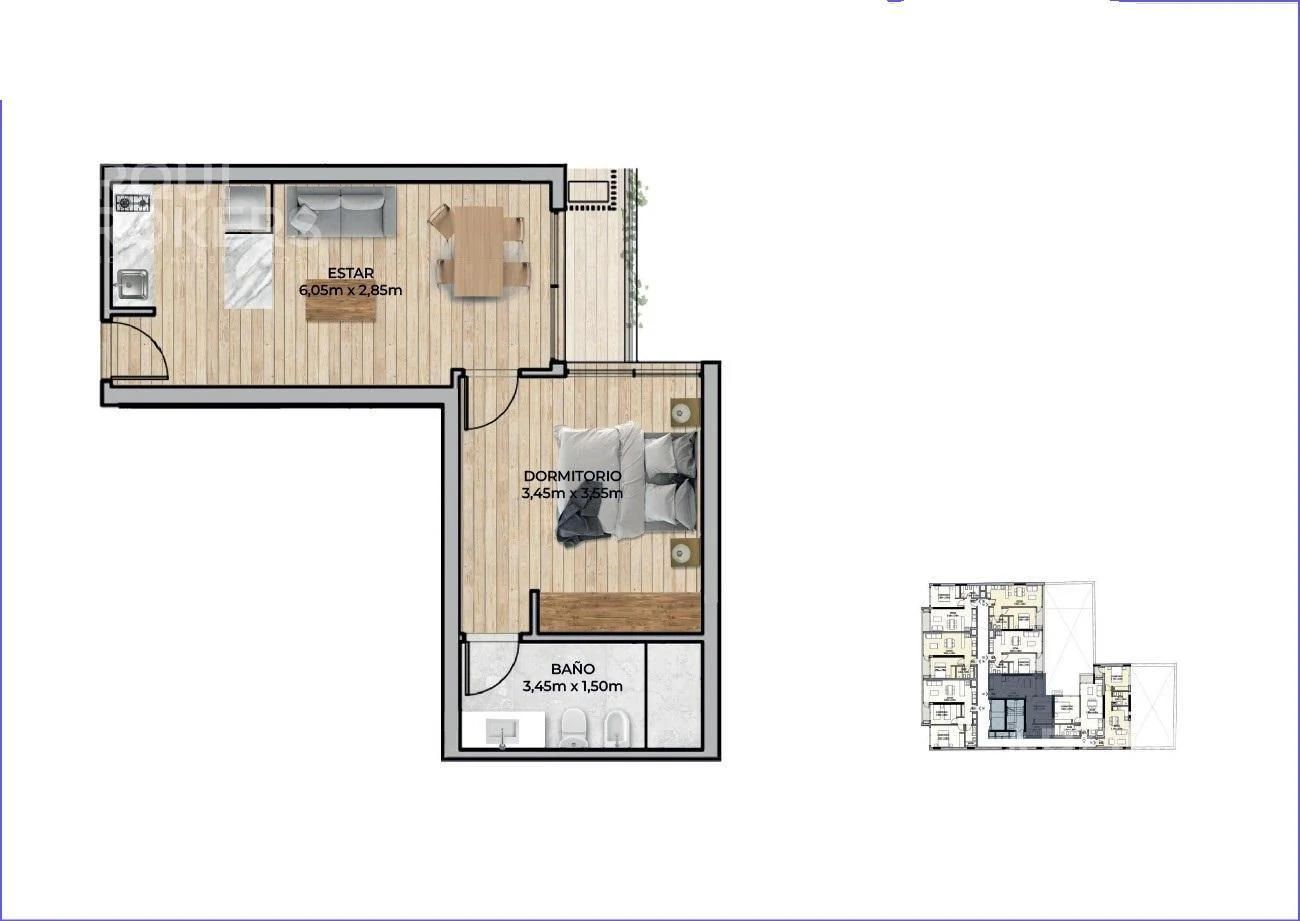 Living comedor con terraza, cocina integrada con placares, anafe y termotanque, 1 dormitorio con placrad, 1 baño completo.
