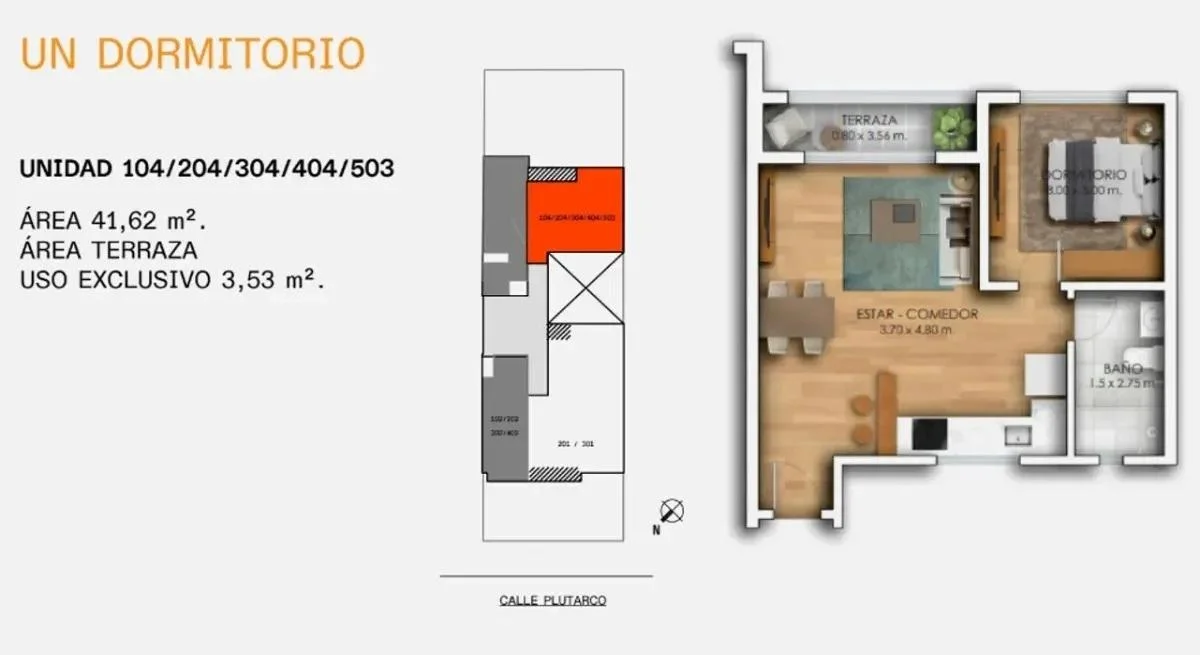 La unidad cuenta con living comedor equipado con aire acondicionado y con acceso a una terraza de 3 m².
