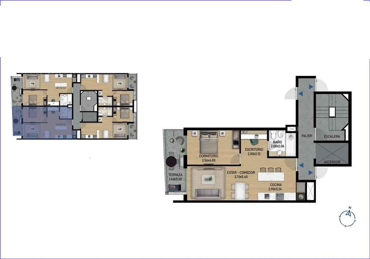 Living comedor con terraza al frente, cocina integrada con placares y mesada de granito, 1 dormitorio con placard, escritorio ó medio