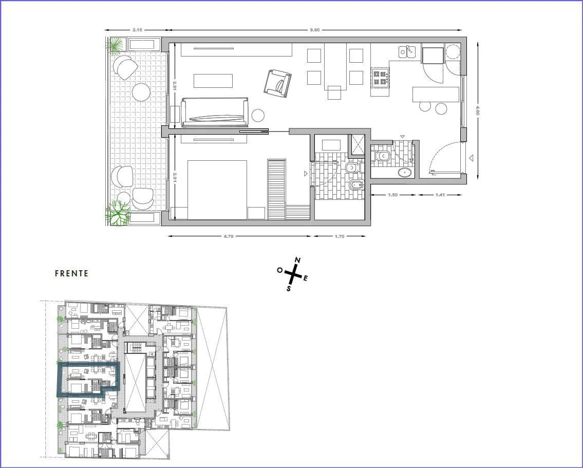Living comedor con terraza al frente, cocina integrada con placares, con bacha de acero inoxidable y mesadas de Silestone, horno anafe y campana de extracción. 1 dormitorio en suite con vestidor, 1 baño completo y 1 baño social.