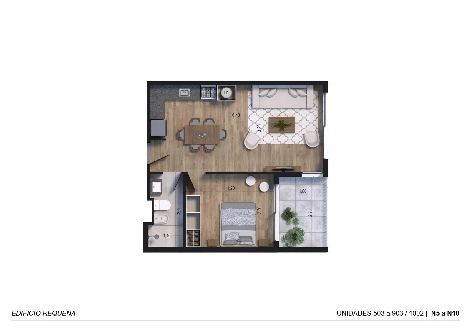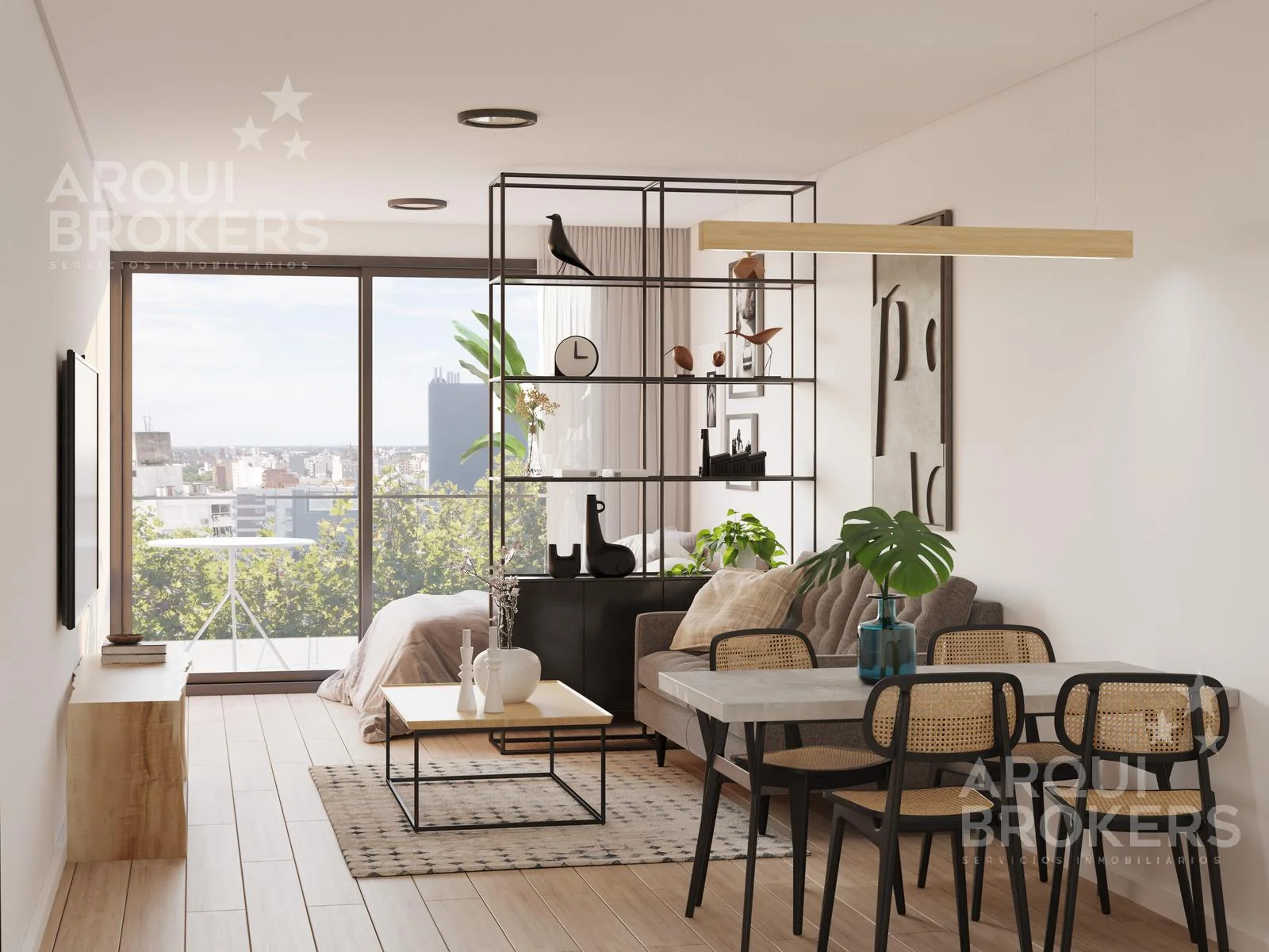Living comedor con terraza, cocina integrada con placares, 1 dormitorio con placard, 1 baño.