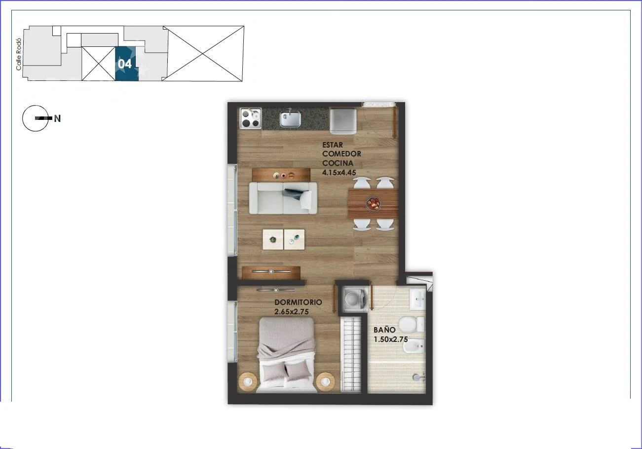 Living comedor con cocina integrada con placares, 1 dormitorio con cortina de enrollar, 1 baño.