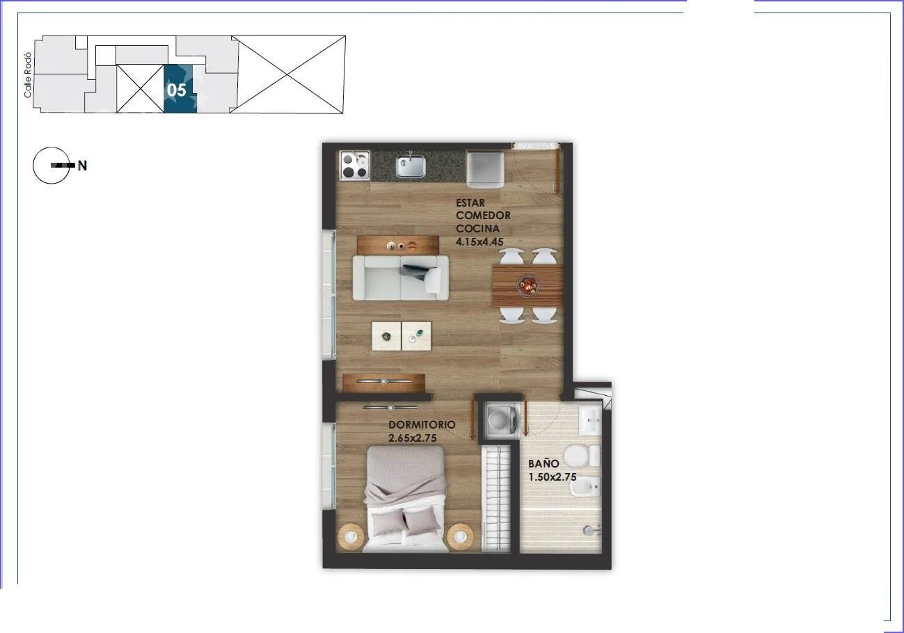 Living comedor con cocina integrada con placares, 1 dormitorio con cortina de enrollar, 1 baño.